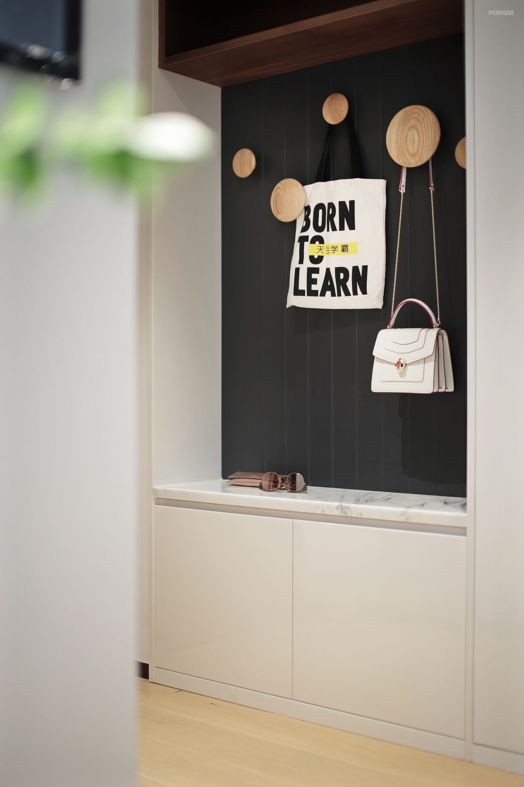 内嵌式玄关柜留足了高度,下方可以放置更换的鞋物,上方则预留出更换鞋物和悬挂收纳的空间。木质地板搭配白色玄关柜,干净简约。木纹的挂钩也是房间的一大亮点,给现代感的房间增添自然的气息。玄关柜上的收纳袋和包包,不仅不会占用空间反而起到装饰的作用,一举两得。