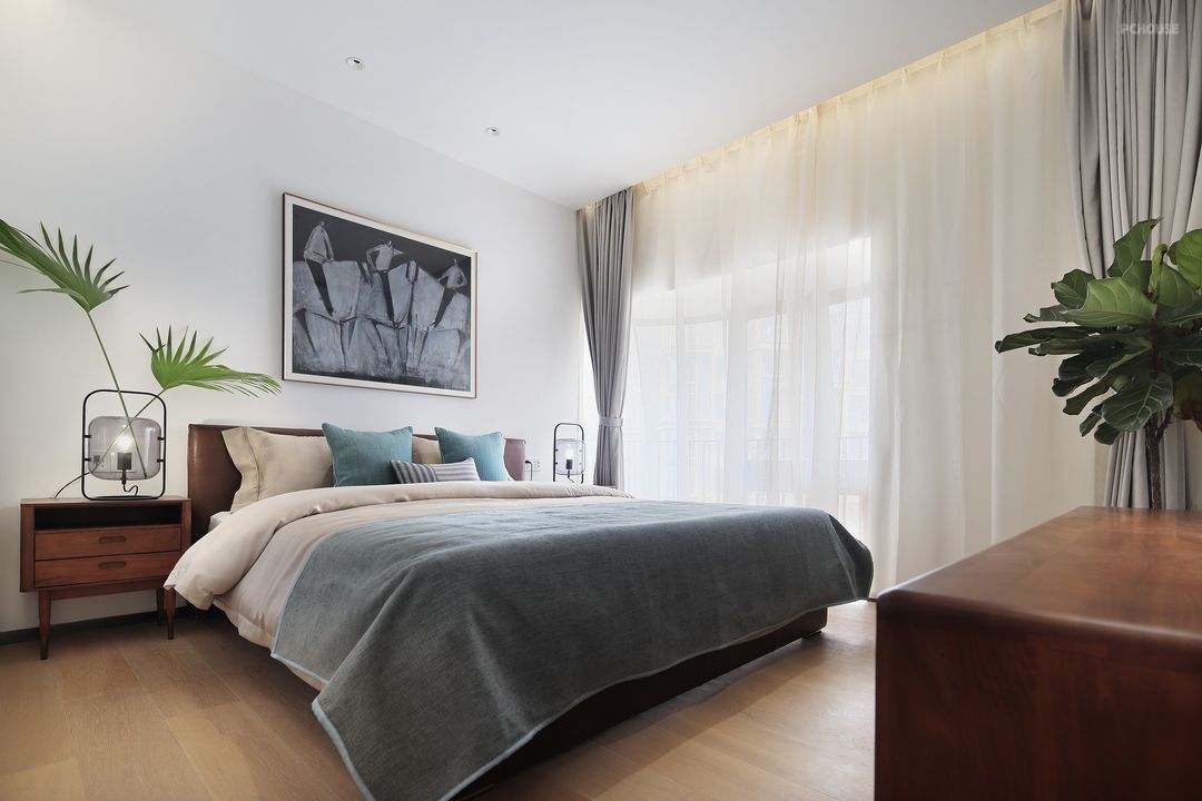 业主对于主卧的要求就是简约大方。原木色的地板搭配纯白色的墙壁,清新自然。一整面的落地窗,让卧室得到充足的采光,不用担心潮湿闷热,垂地的灰白两色窗帘极具质感。床头的简笔画让整个墙面不再单调,具有艺术气息。