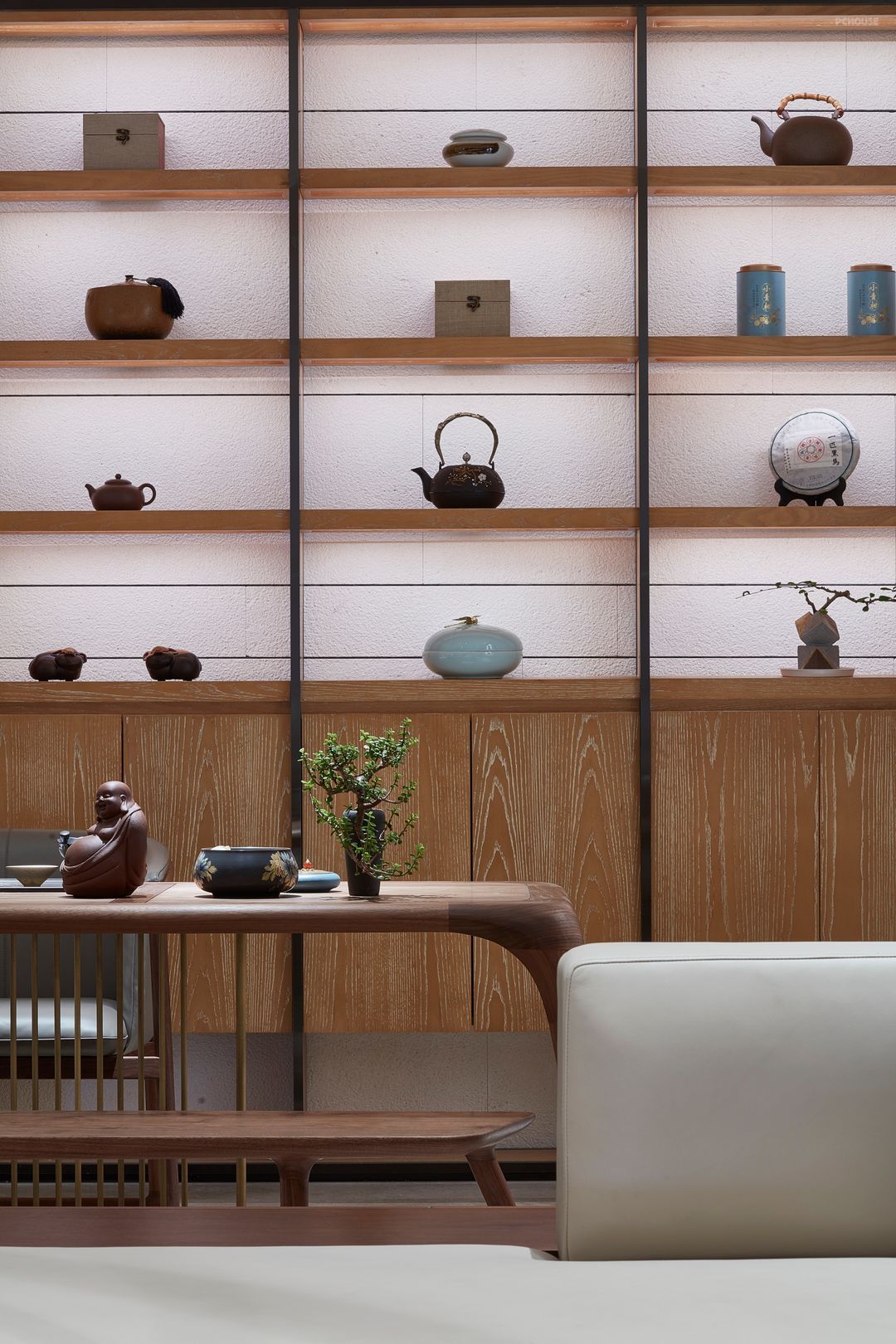 精美和造型各异的茶具,别致的绿植。后面的柜台茶格上盛放的茶壶以及各种收集的茶叶都透露出品质和主人高级的品味。