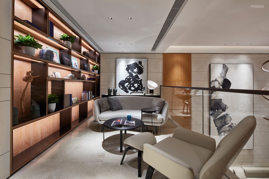 休息区。休闲区位于二楼,透明的玻璃防护栏,可以清晰地看到客厅的场景,为家庭增添温馨。休闲区的墙壁和客厅连为一体,灰色的绒面沙发和单座米色真皮沙发,都为休闲的空间提供了一个舒适的环境。墙上悬挂了一副水墨画图,大气又干脆利落,使人感受到丰厚的艺术气息。一旁的内嵌式木柜,不均匀的将空间分成多个方格,杂而不乱,柜架上摆放的各种绿植和艺术摆件,都透出浓浓的品质,是一个休闲读书,会客的好地方。