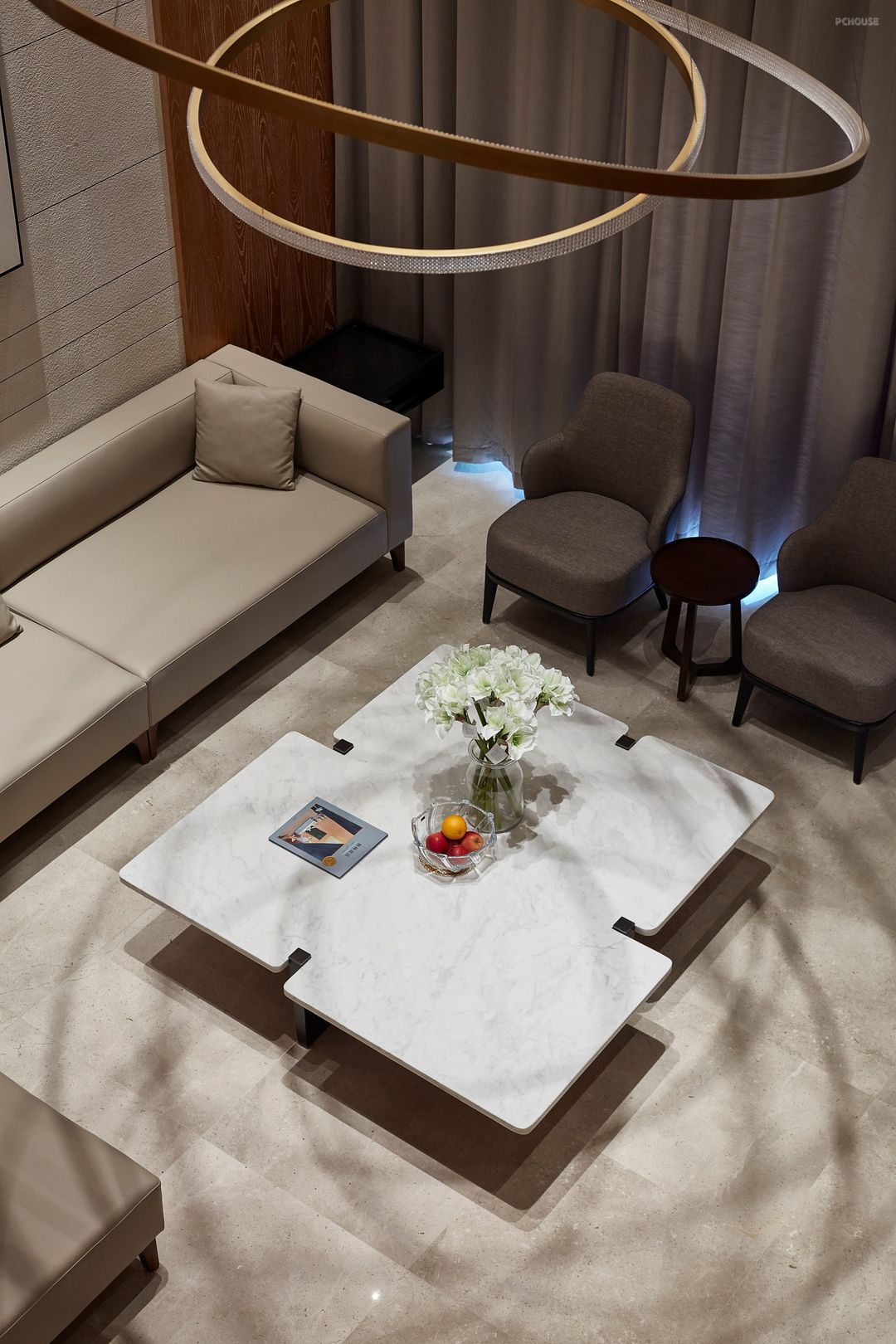 从楼上往下可以清晰看见客厅的情形,拼图造型的茶几和吊灯隐射的光影,带来视觉的美感与享受。