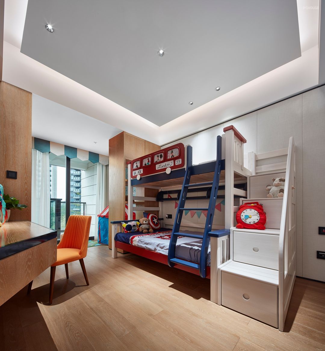 儿童房采用的是木地板,和整个房屋设计的新中式不同,儿童房的设计采用了富含趣味性的上下床,以及色彩丰富的床体和床面,有助于孩子活泼天性的释放,并给他一个积极的生活环境。吊顶也设计成可爱的五角形,时刻为孩子的创造性做出培养。