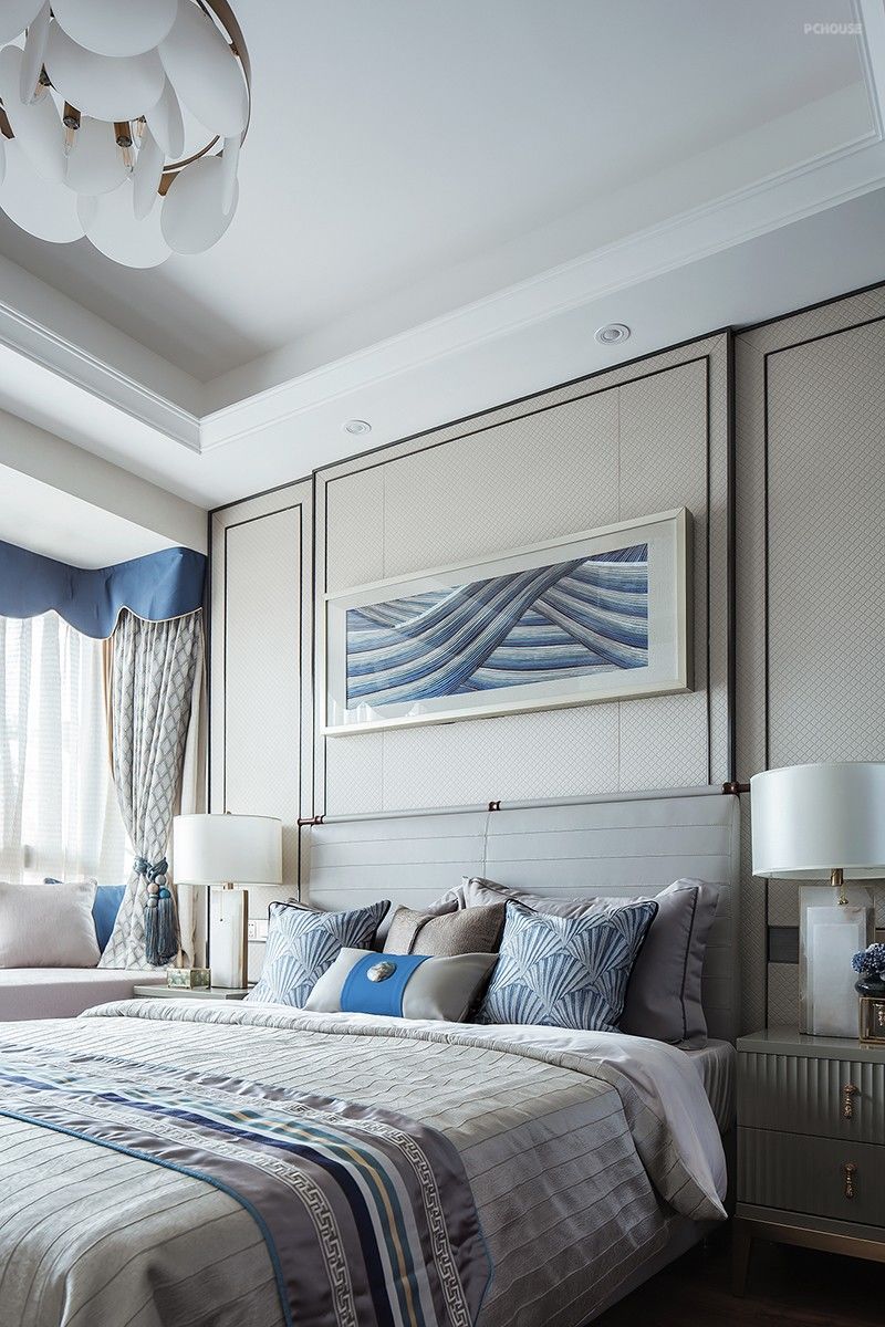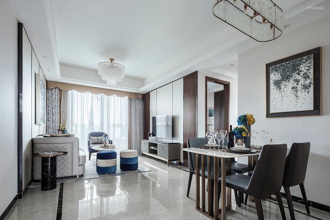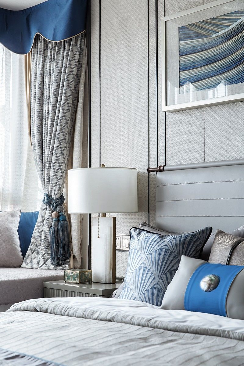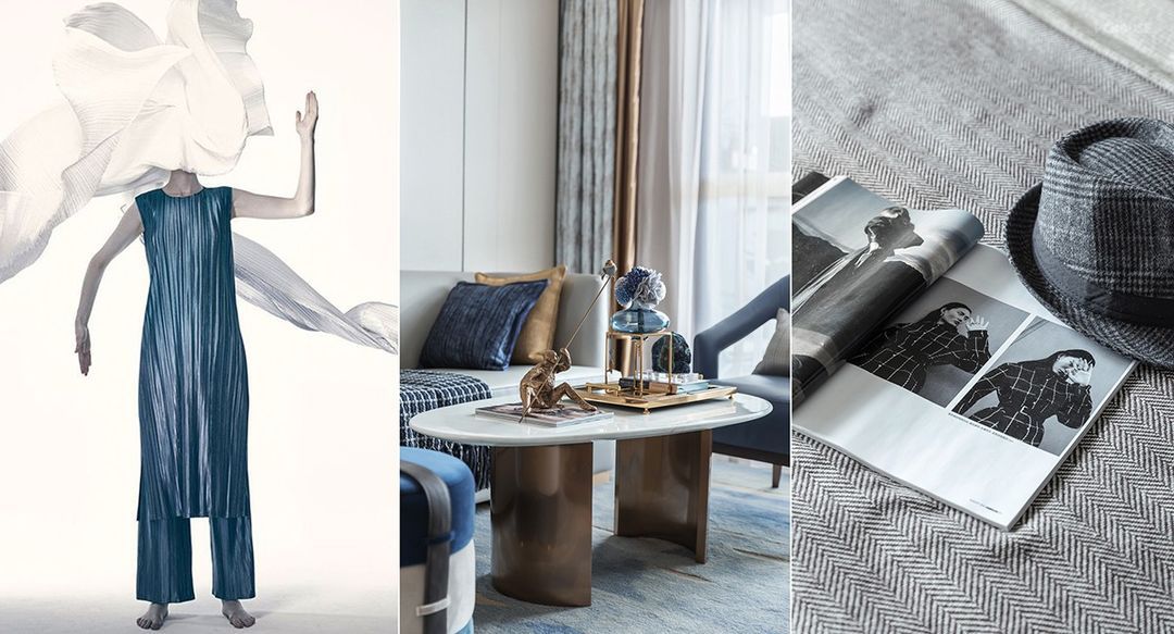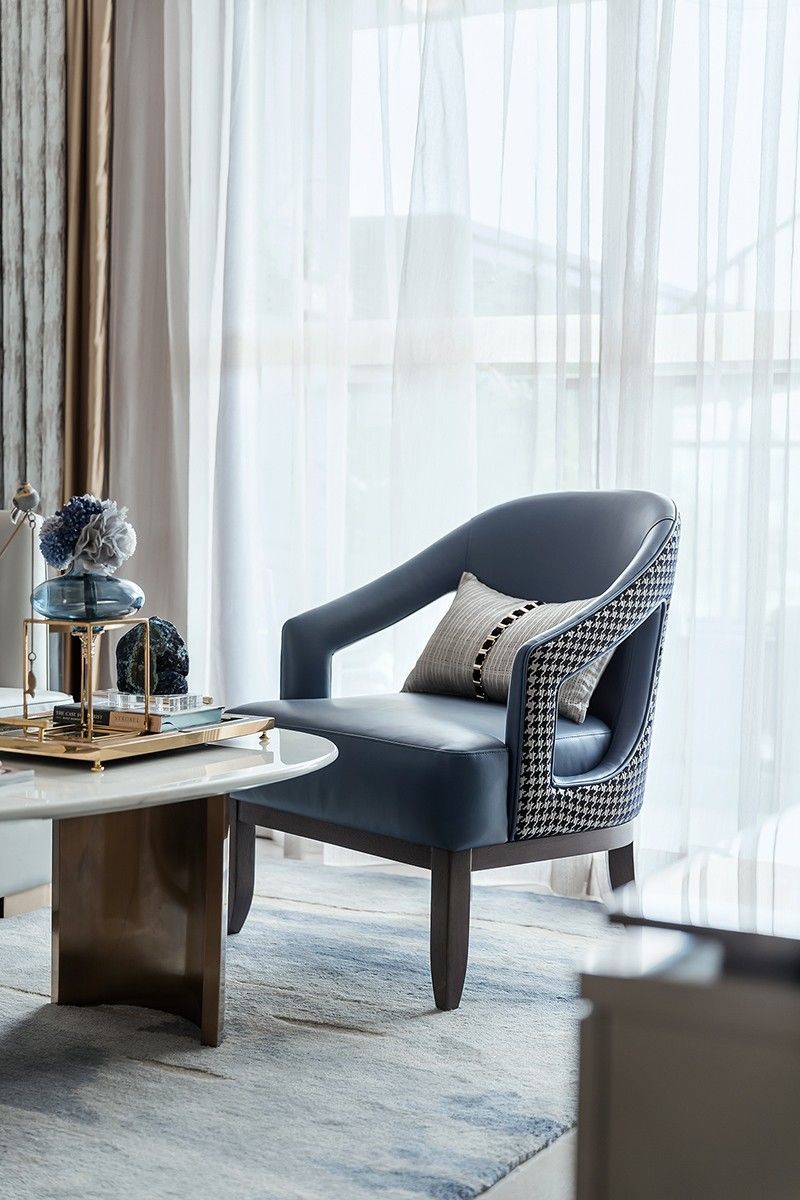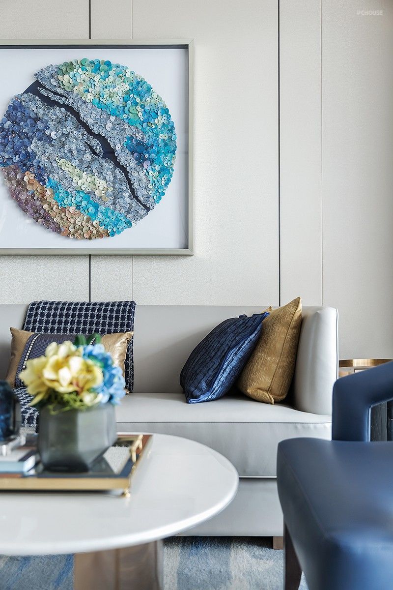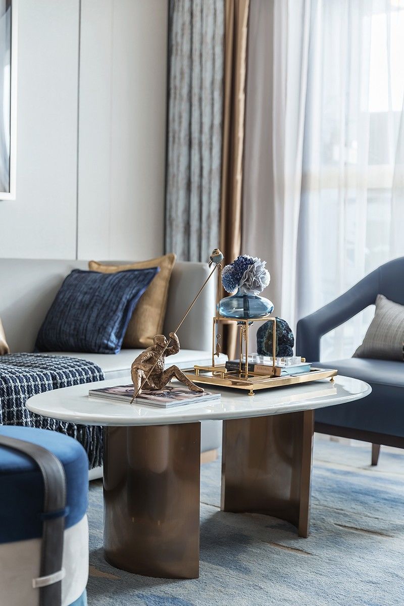 近而不浮,远而不尽,中式元素与现代材质巧妙兼容,再现了移步变景的精妙小品。深深浅浅的蓝色隐含克制,既