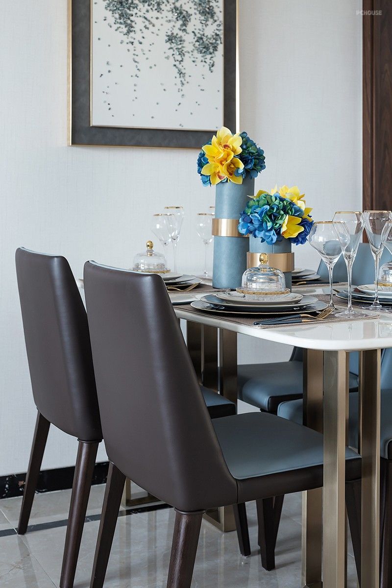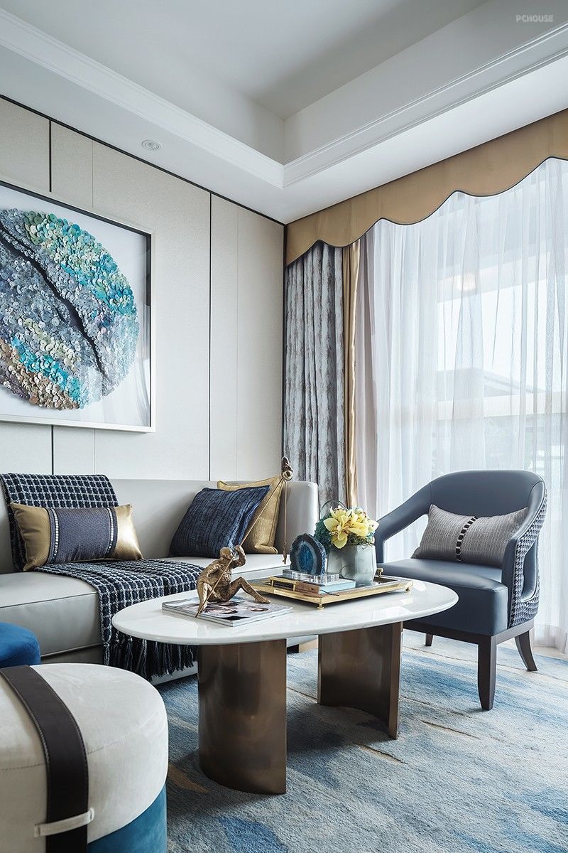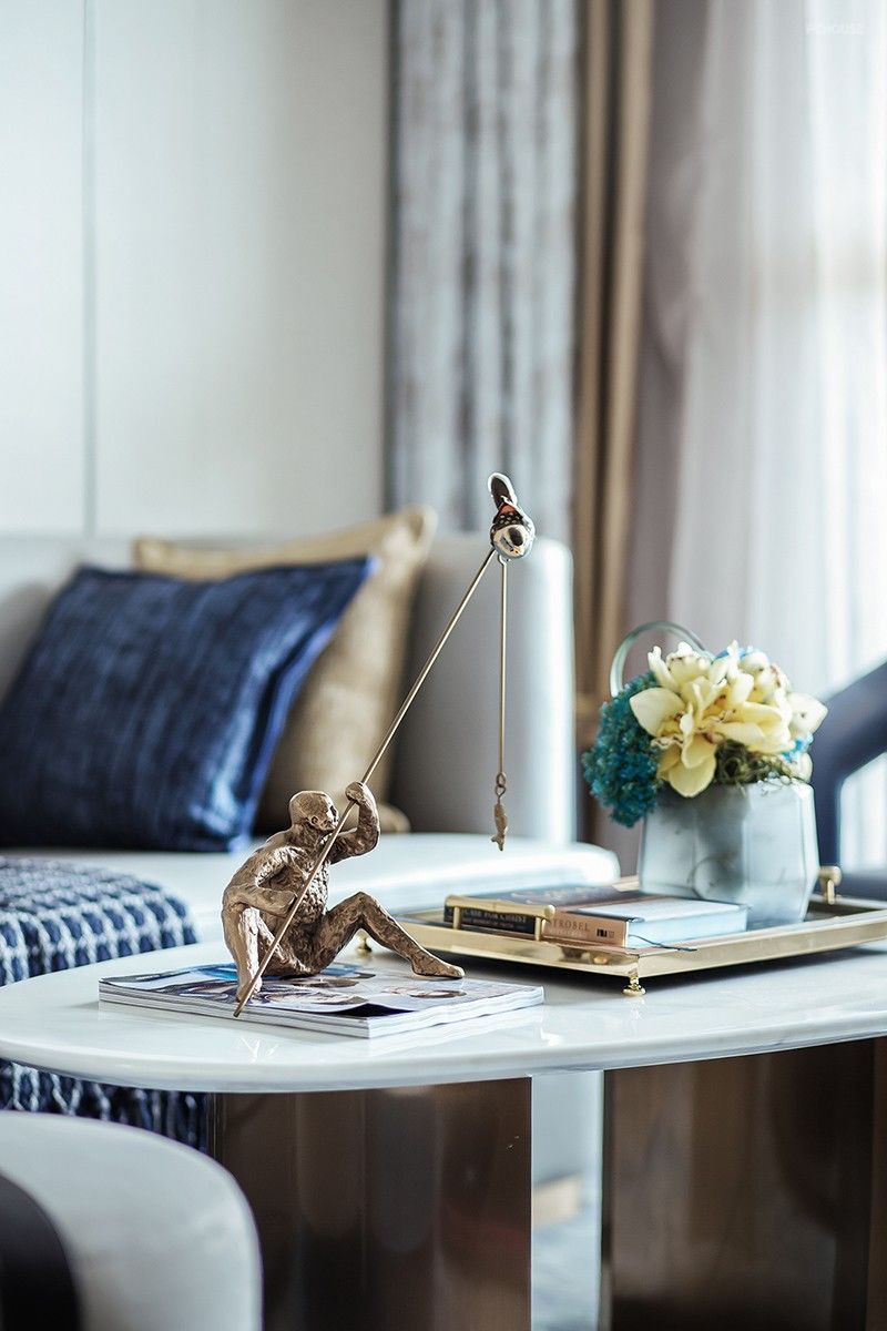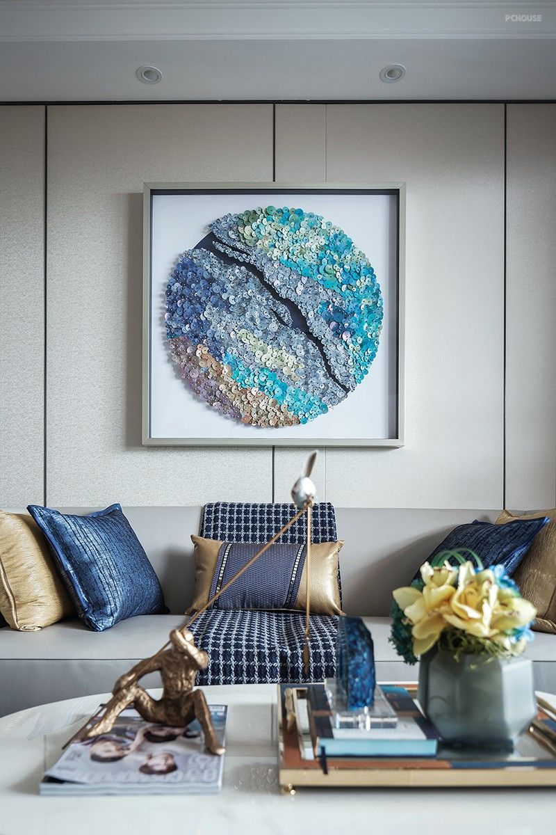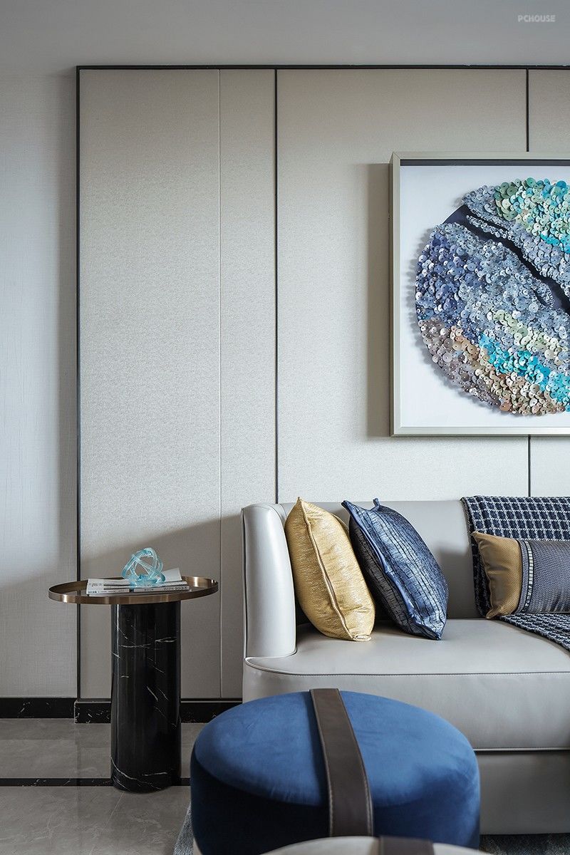 客厅选用素米色的极简丝质背景墙,茶几上雅士水波纹理石饰面来定义空间的清雅柔和,清雅的湖水蓝与格纹搭毯轻轻地挑起空间的韵律美感,搭配蓝黄花艺,空间附着着一层恰到好处、不过于浓郁的浪漫情调。阳光透散过微透的纱帘为空间染上一抹暖意,令人们不觉沉溺于韶华中的闲适与安缓。低饱和度的材质,使小空间显得宽阔舒适。米灰、浅金、湖蓝,以一种隐形的色彩组合,叙述空间的层次。