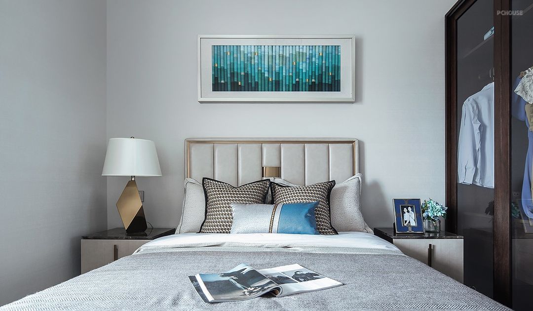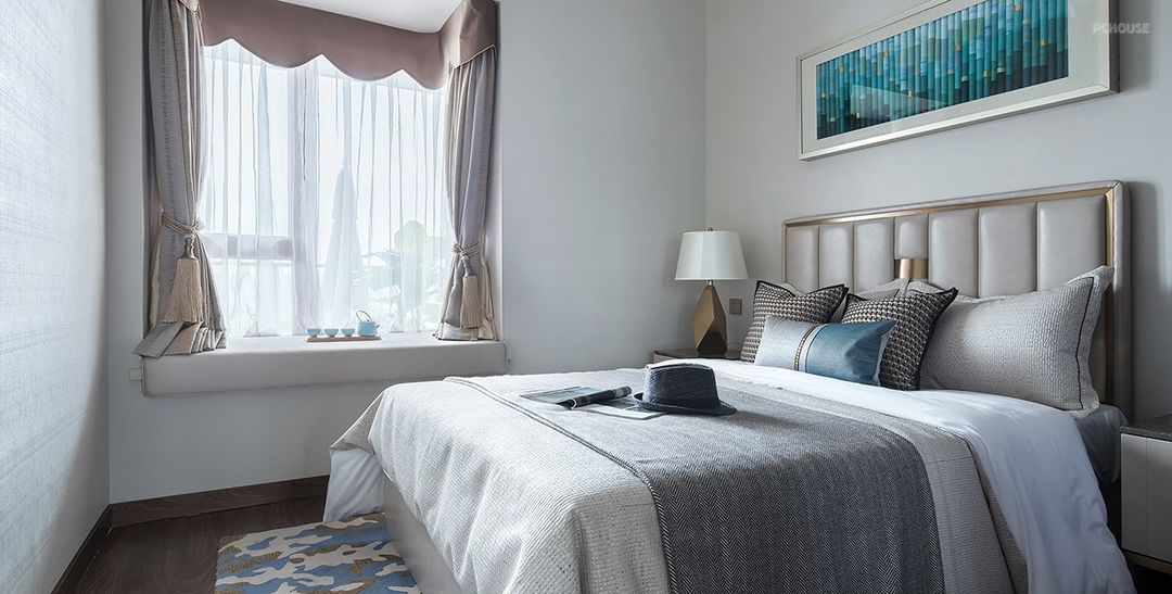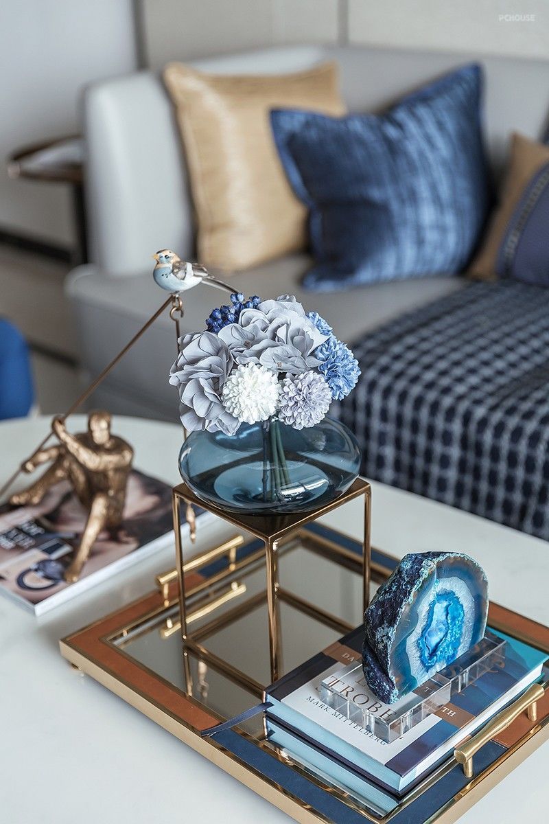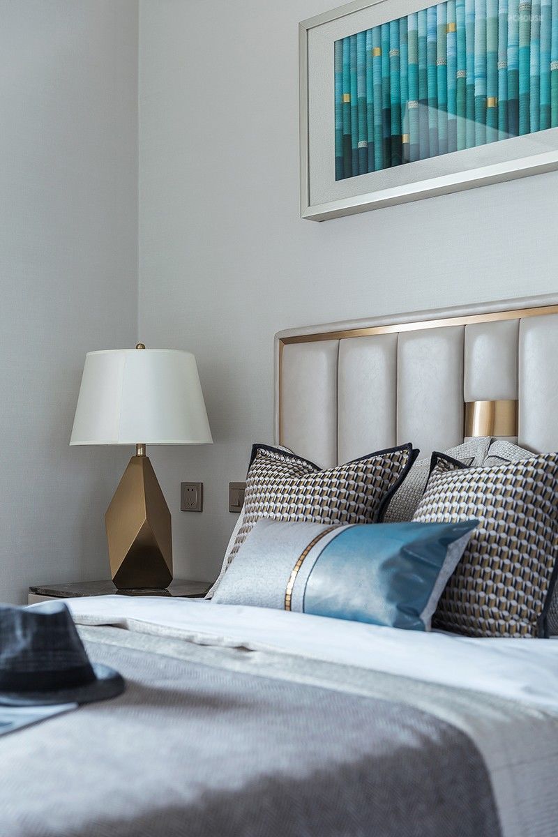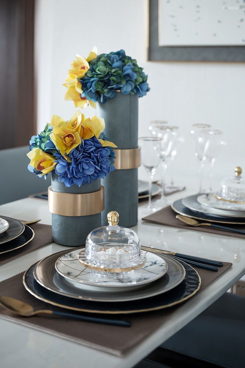 客厅选用素米色的极简丝质背景墙,茶几上雅士水波纹理石饰面来定义空间的清雅柔和,清雅的湖水蓝与格纹搭毯轻轻地挑起空间的韵律美感,搭配蓝黄花艺,空间附着着一层恰到好处、不过于浓郁的浪漫情调。阳光透散过微透的纱帘为空间染上一抹暖意,令人们不觉沉溺于韶华中的闲适与安缓。低饱和度的材质,使小空间显得宽阔舒适。米灰、浅金、湖蓝,以一种隐形的色彩组合,叙述空间的层次。