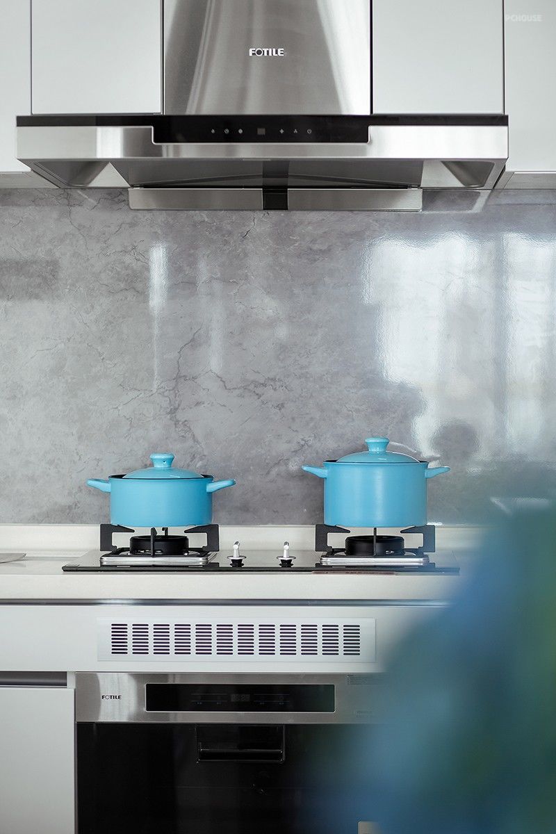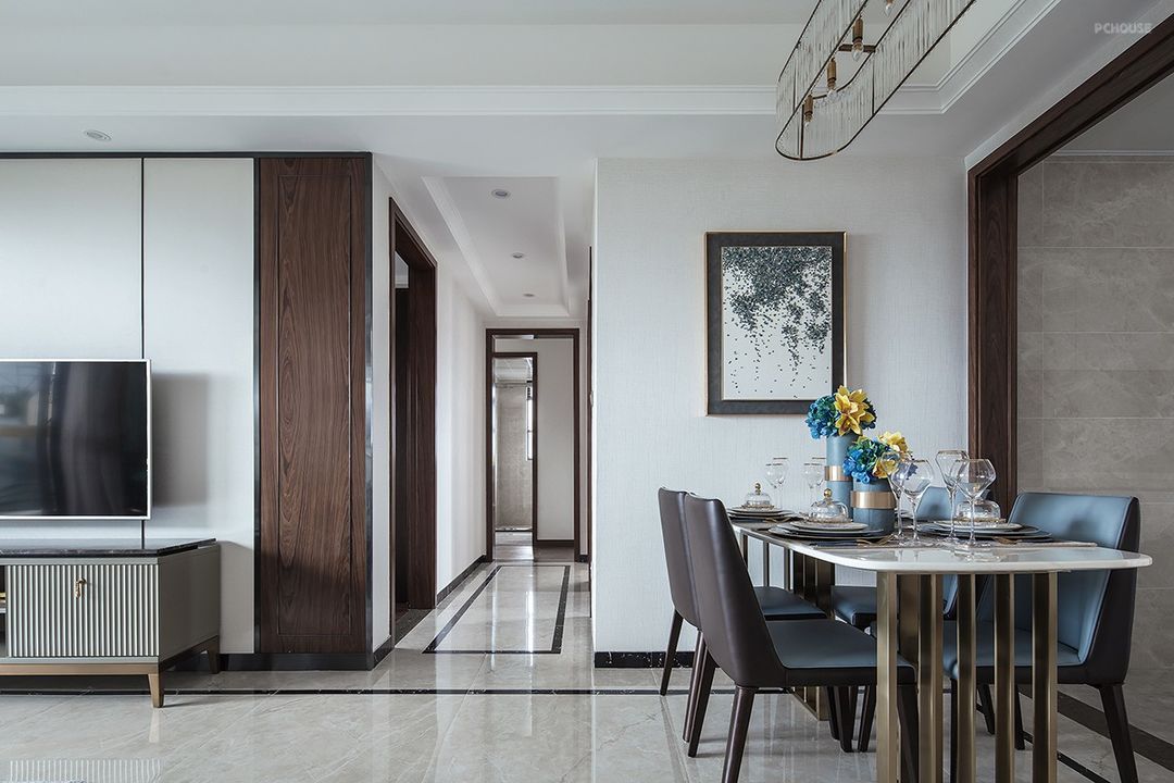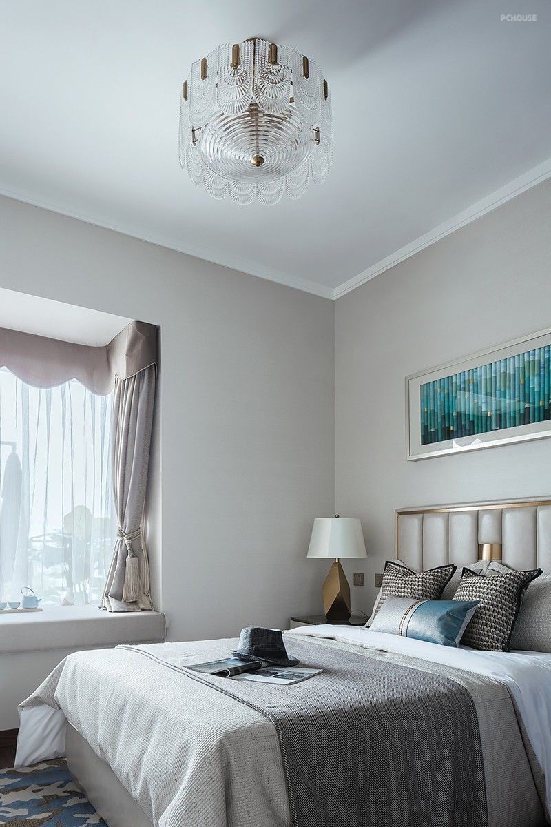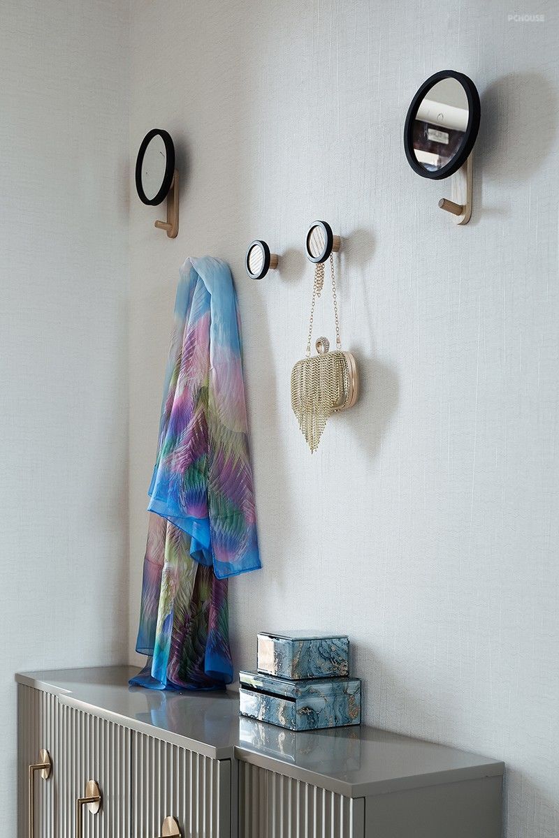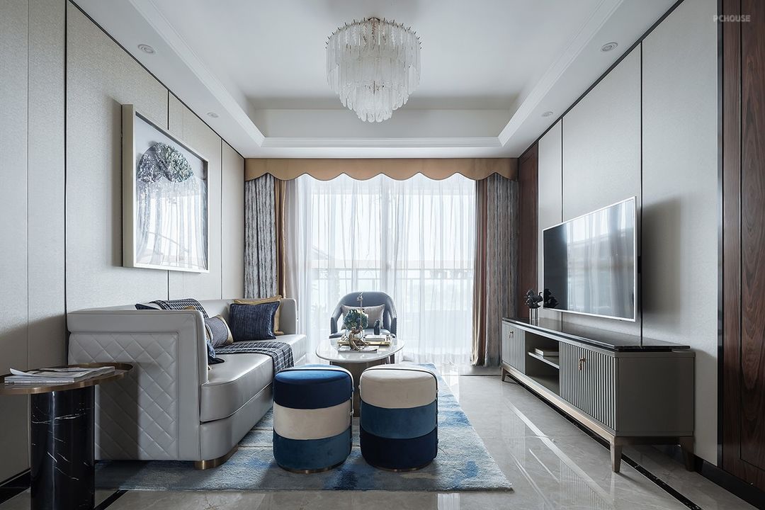 客厅选用素米色的极简丝质背景墙,茶几上雅士水波纹理石饰面来定义空间的清雅柔和,清雅的湖水蓝与格纹搭毯轻轻地挑起空间的韵律美感,搭配蓝黄花艺,空间附着着一层恰到好处、不过于浓郁的浪漫情调。阳光透散过微透的纱帘为空间染上一抹暖意,令人们不觉沉溺于韶华中的闲适与安缓。低饱和度的材质,使小空间显得宽阔舒适。米灰、浅金、湖蓝,以一种隐形的色彩组合,叙述空间的层次。