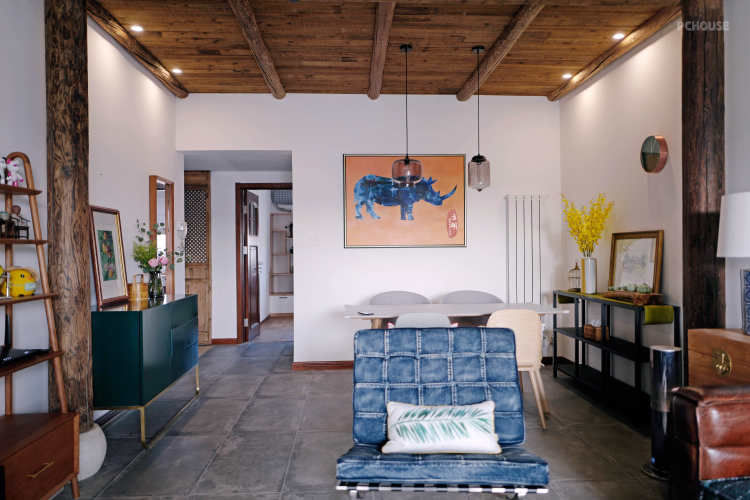 客餐厅一体,空间显得很宽敞。餐厅用了老木板吊顶,石墩+木柱把餐厅与客厅做了分割,巧妙的营造出一方似院落的小天地。