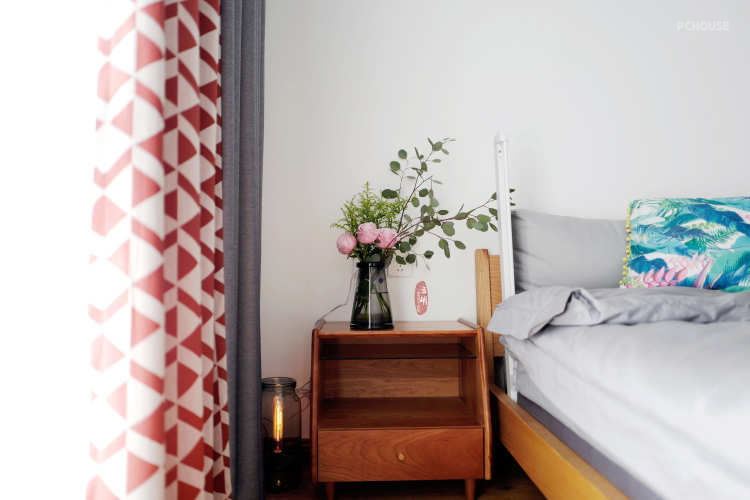 床对面是一个五斗橱,是很多小物件的收纳利器。女主人喜欢花草,小小的绿植可以鲜活一隅,使整个房间春意盎然。