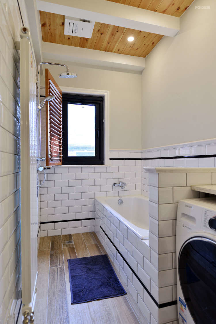 最终设计如下。洗衣机与台盆放一起,增加了台面的长度。浴缸砌了半墙,即隔断,又使空间开敞。