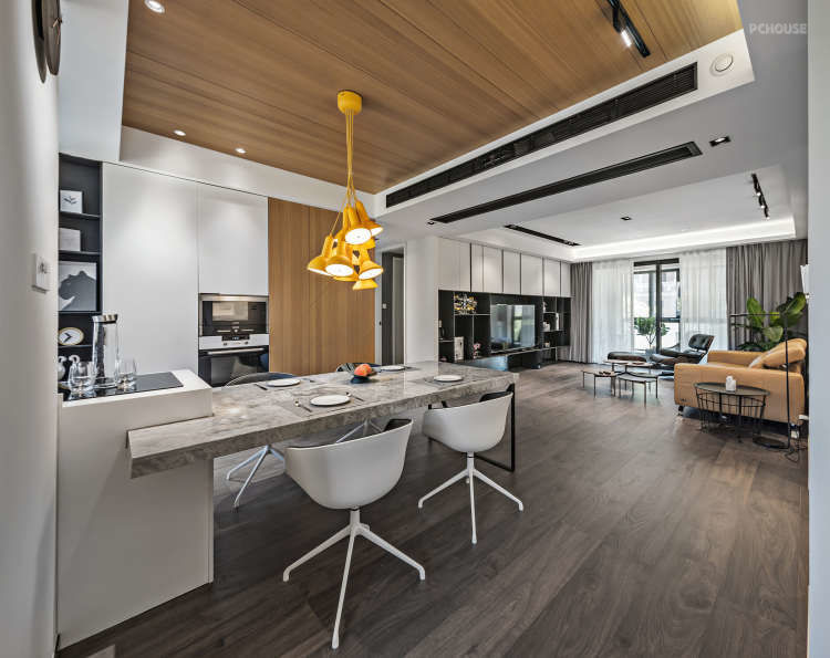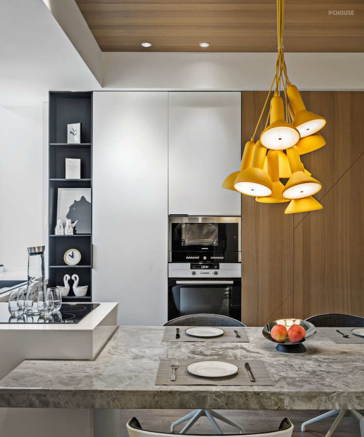 台面大理石选的还挺漂亮,最终效果云纹斑驳,期间本来想用超薄的西班牙德赛斯岩板,造价太高最后放弃。