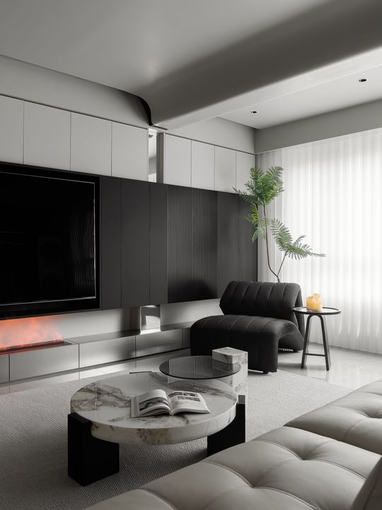 原次卧室和主卧室的门封闭,次卧门洞嵌入冰箱与左边收纳柜形成装饰一体,主卧室门封闭做成装饰柜,与右边储藏柜形成对称感极强的电视墙,整个餐厅与客厅立面装饰用灰色形成一体,视觉整体更宽敞。