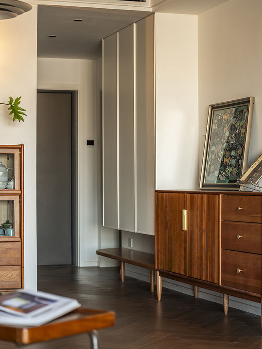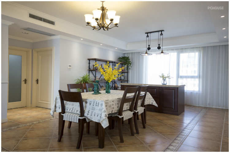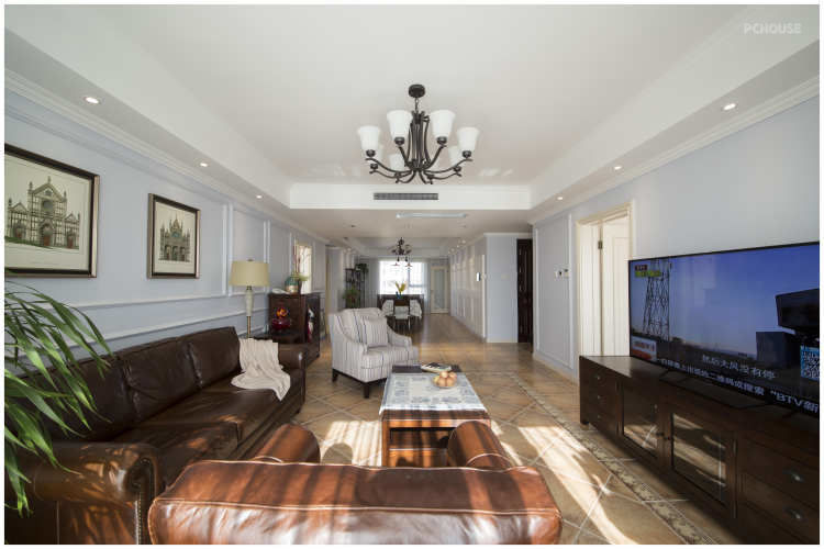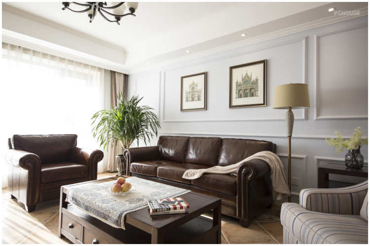 客厅与餐厅相连,家务动线合理。两边窗户相对,并安有新风,在雾霾严重的北京新风是必不可少的。价值12万的三人位真皮沙发,低奢也舒适。茶几选购实木材质的,葫芦脚装饰的茶几更为客厅增添一丝古典气质,与美式风格相呼应。实木茶几比其他材质的茶几打理起来更方便,寿命也更长。诺贝尔家的地板,经典的美式瓷砖图案。