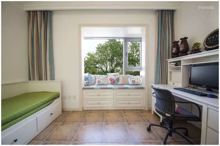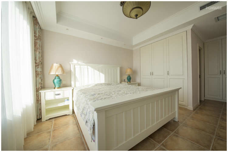 美式卧室主要讲究舒适和温馨,多用温馨柔软的软装布艺来表示。用色上布艺须与硬装颜色协调统一。卧室整体家具都选购白色的,碎花窗帘与米白的家具透射出阳光的温暖,浪漫又柔和。书香门第的地板与客厅颜色相同但样式不同。