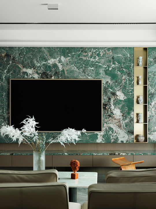 客厅背景墙为美式石膏线装饰,石膏线可塑性强无论什么样的风格都能完美融入。次外石膏线具有防潮、防水、隔音、隔温等特性有些还用来代替吊顶,成本低。石膏线有两种施工方式:一种是粘上去,一种是钉上去。施工师傅采用的是“钉”的方式。