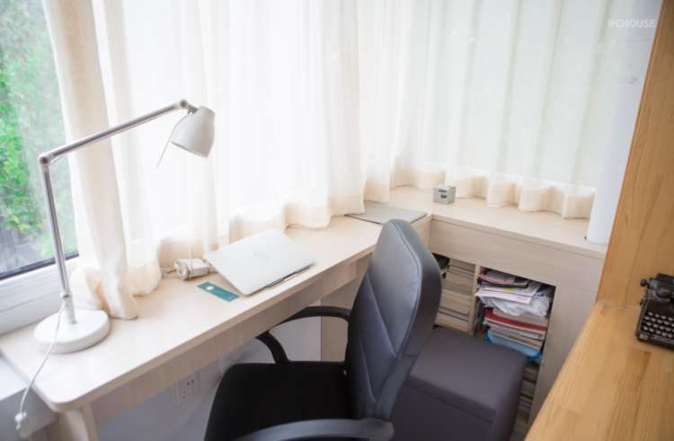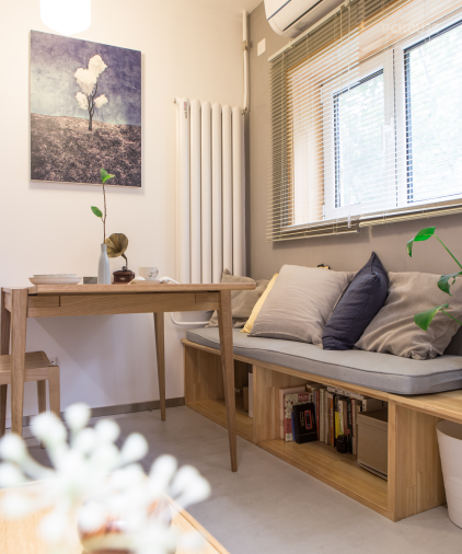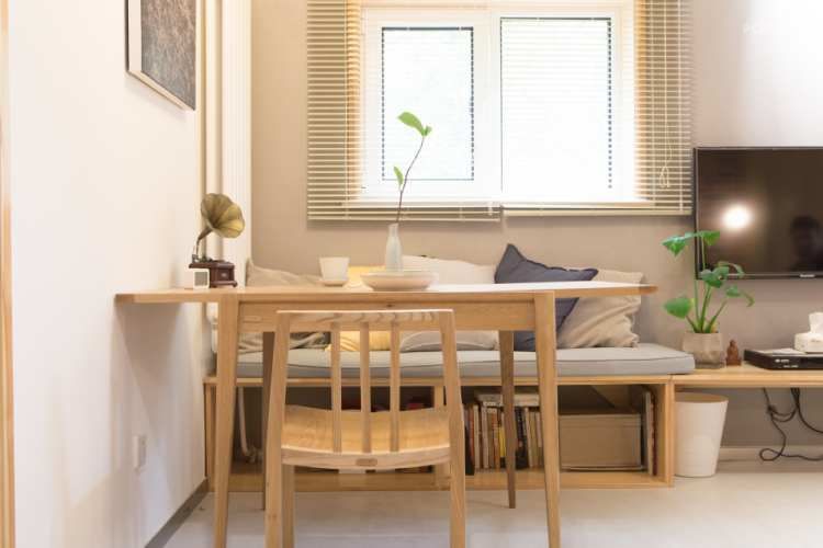 餐椅用可收纳的柜子的充当,并且靠墙放置节约了很大空间,铺上一个软软的垫子,地方舒服了读书也会有耐心。设计师之前将餐桌设想为拉伸式,但考虑到业主生活习惯和装修效果最后决定使用实木餐桌,搭配日式风格的客厅刚刚好。鹅黄色的百叶窗凸显禅意。