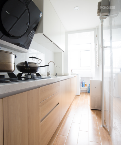 ▲厨房实景图厨房使用木纹砖,木纹砖是一种表面呈现木纹装饰图案的陶瓷劈离砖,纹路逼真、自然朴实、没有木地板褪色、不耐磨等缺点,是易保养的亚光釉面砖。适用于厨房替代木地板。