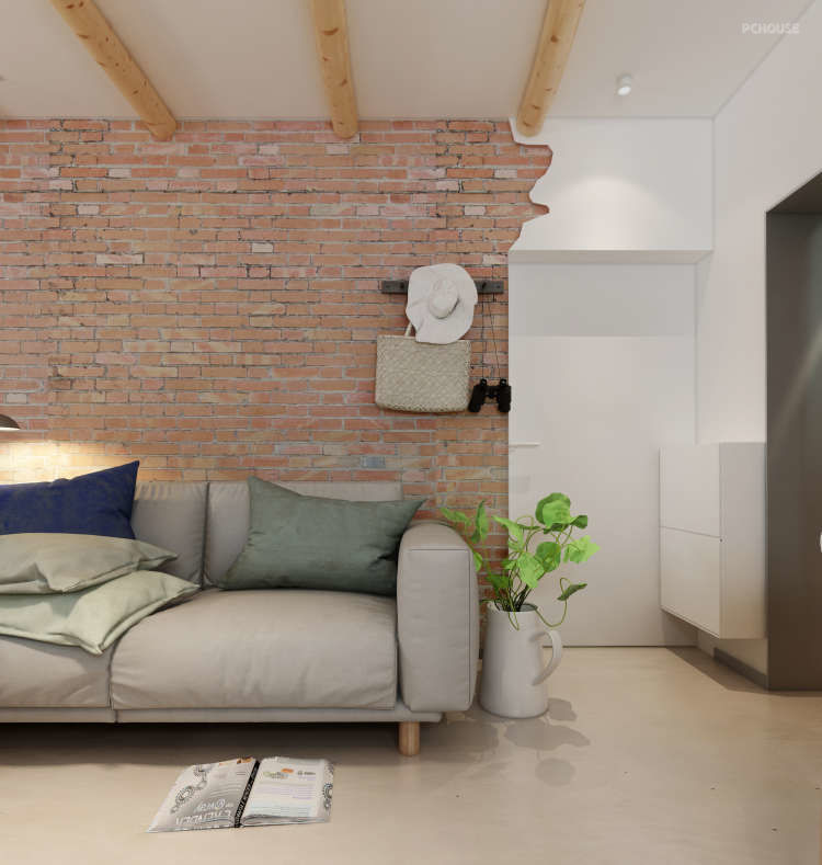客厅整体材质上通过水泥自流平,红砖,木地板,松木搭配出简单,放松得空间。取材自然,工艺精良,功能至上。崇尚极简,极简但不等于简陋,反而在选材时更加考究。座与电视台面相连,增加空间叠合利用。