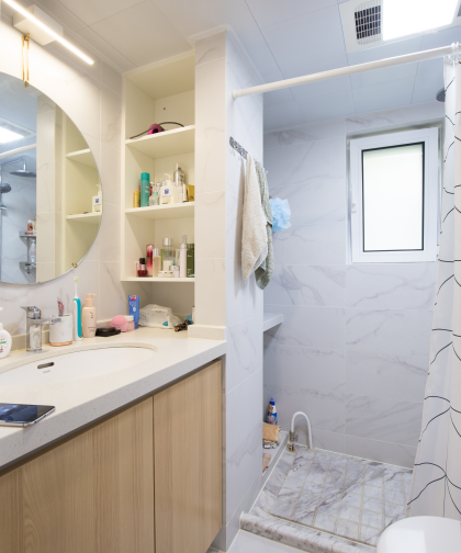 设计师在卫生间打造了几个壁龛,卫生间空间小,上墙收纳会扩展出很多空间。浴帘起到干湿分离的作用,淋浴地面收边让水渍不会流出来。