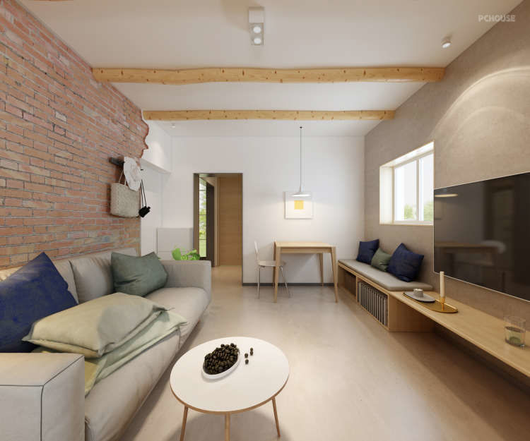 ▲客厅效果图设计亮点:1.水泥自流平,红砖,木地板,松木打造日式风格2.原木家具,原生态环保3.扩大客厅面积,次卧做成榻榻米增形式,保留休憩功能附加储物功能