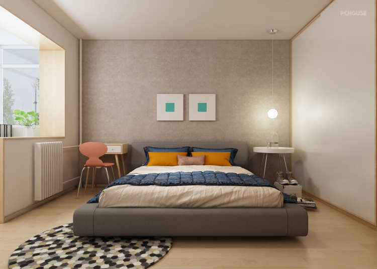 ▲卧室效果图设计亮点:1.针对卫生间面积过小的问题,设计师最终决定向主卧扩出60厘米的空间。2.打掉窗户引入室外光线。