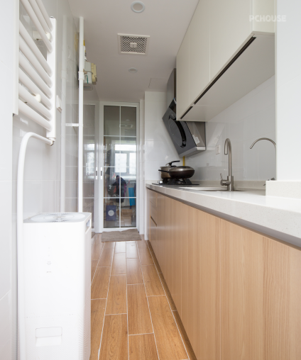 ▲厨房实景图设计亮点:1.一字形厨房布局2.洗衣机移至厨房厨房门采用玻璃材质,保证透光性。