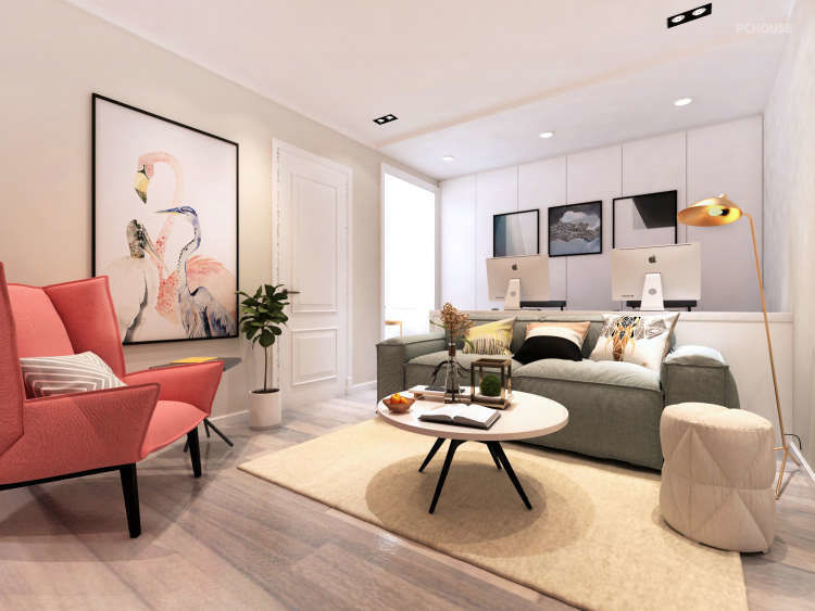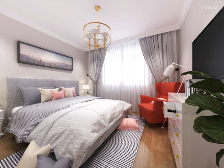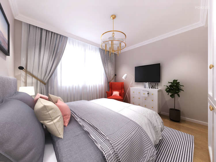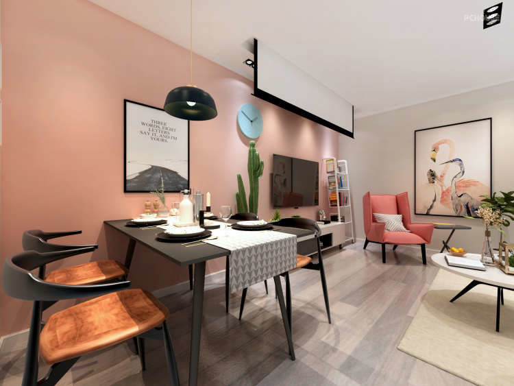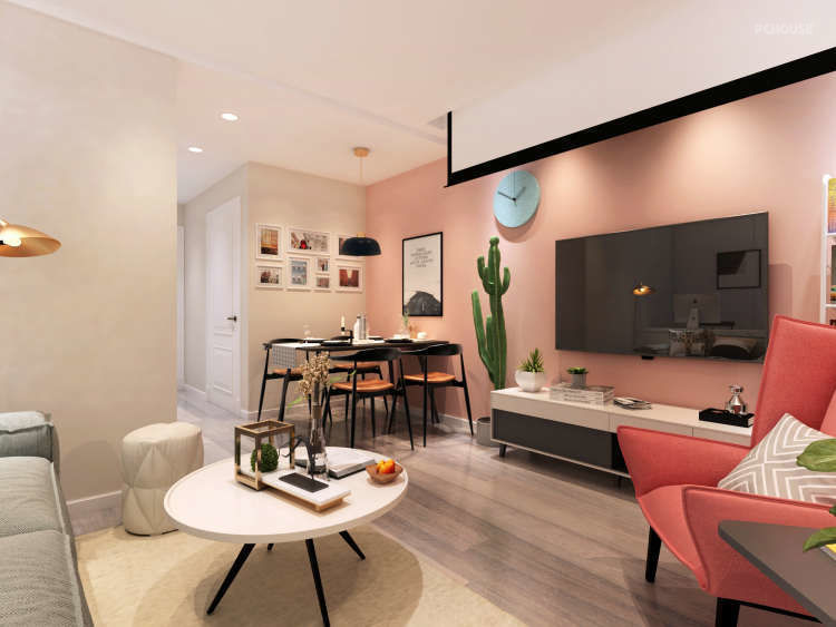 设计师用裸粉色墙面来代替电视背景墙,给整个客厅带来视觉上的冲击,变得更加活力四射。除了电视机,设计师还为业主安置了一个投影仪,晚上来看电影效果很棒!幕布尺寸一般不建议低于100寸,因为80寸的液晶电视已经很多了,小尺寸的幕布很难达到身临其境的效果。一般而言,30平米的居室,安装16:9的120寸-133寸幕布是可以的,而40平米往上的居室,一般就得133寸以上为佳。
