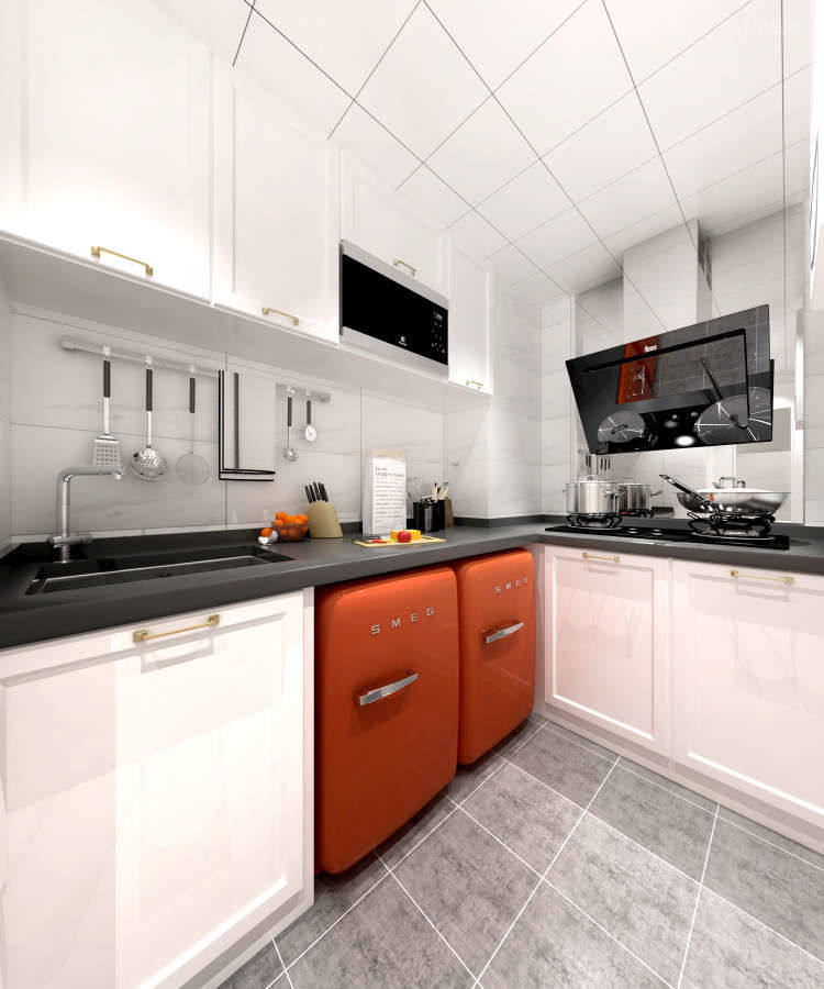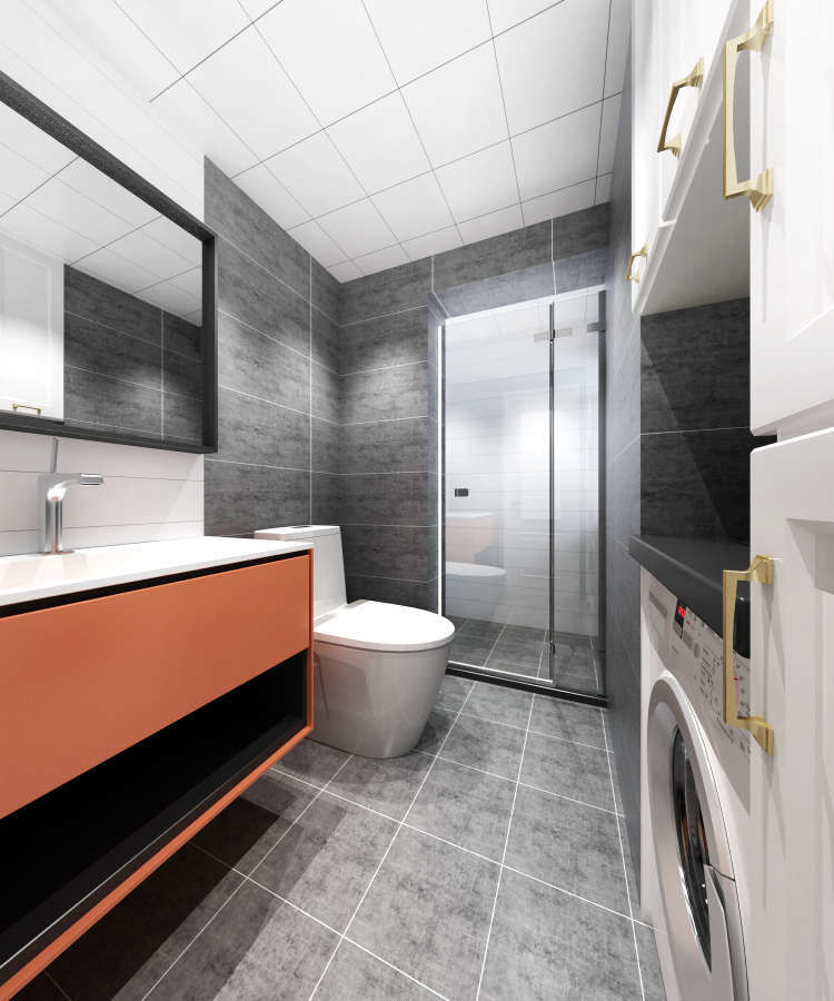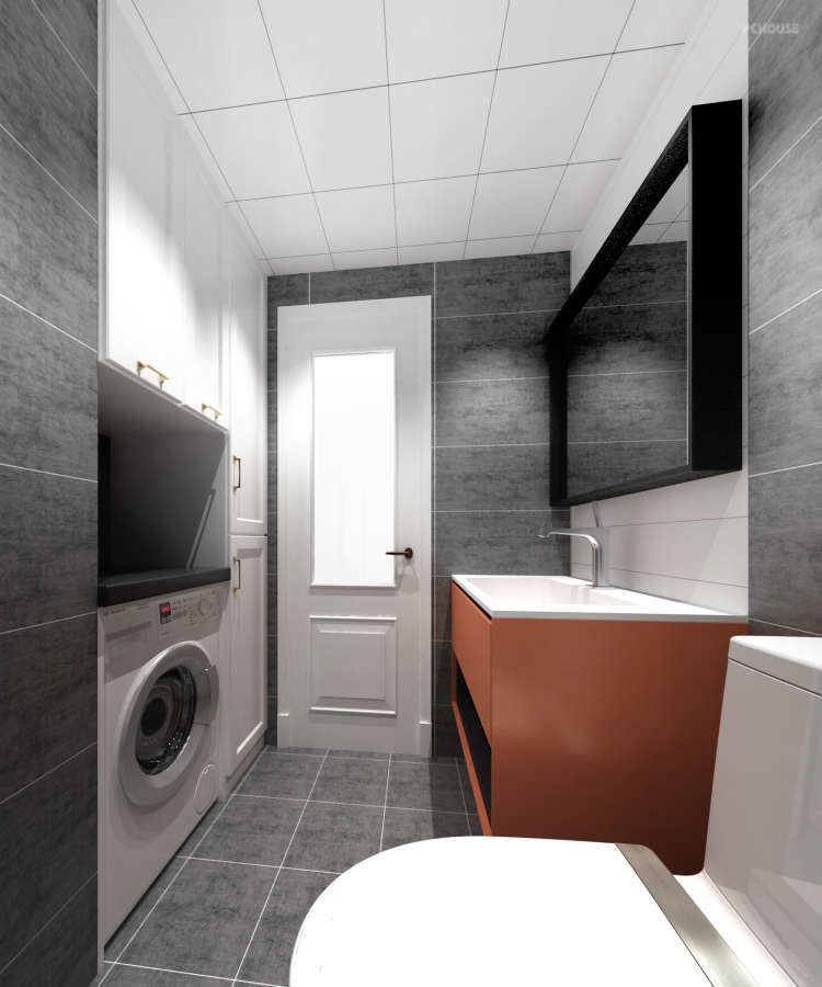 卫生间整体采用浅灰色背景,而橘色浴柜让灰白的浴室豁然一亮。有人说室内装修最重要的就是卫生间装修,其实不无道理,假如你没有一个舒适敞亮的卫生间,你会不会觉得生活都无趣了。