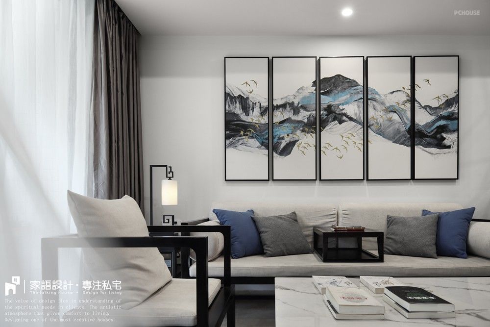 大理石台面茶几、中式台灯、中国风壁画和隔而不断的屏风,将中式元素与现代材质巧妙兼容,方正稳重,一器一物间极赋生活品味。