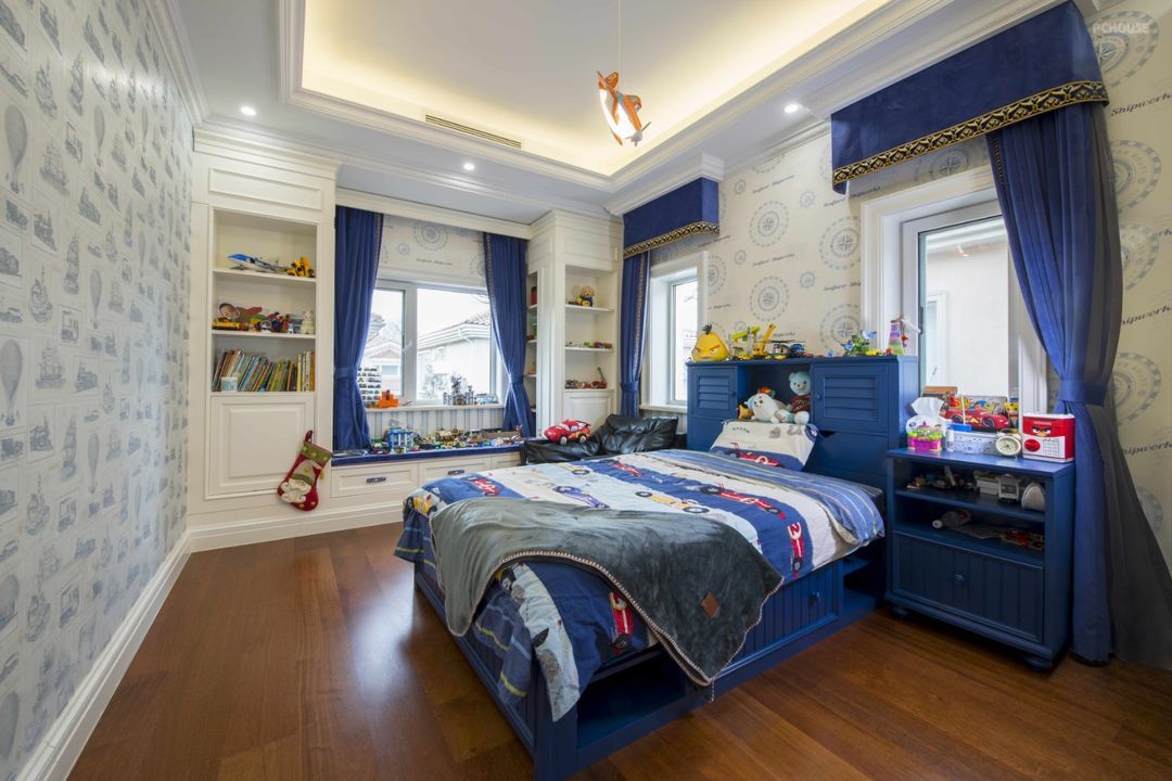 三层是儿童的居住空间,搭配以他们最喜欢的颜色,规划使用功能,让每个空间都有独立的读书与玩具空间。
