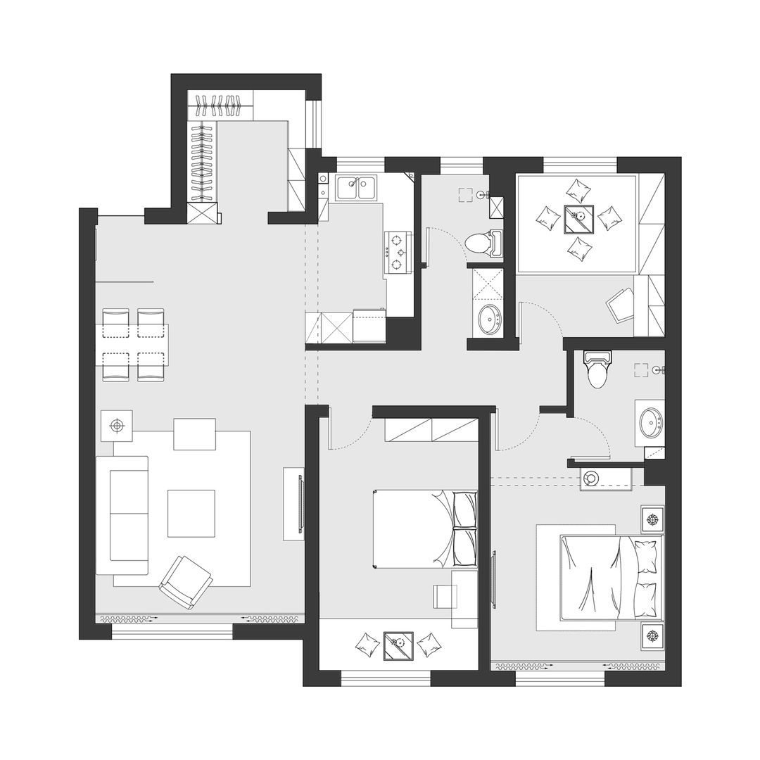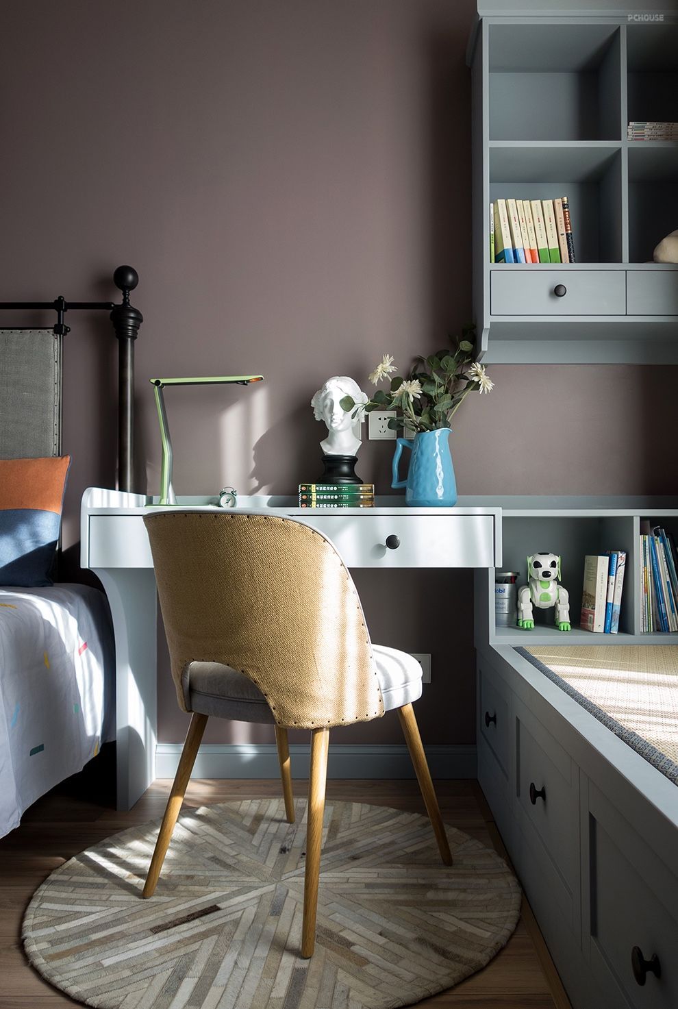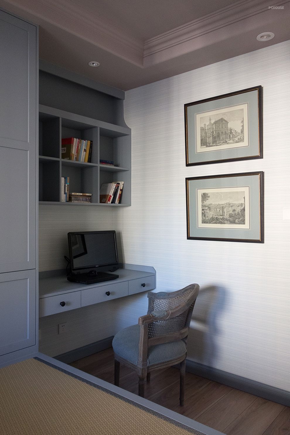 客房&书房:榻榻米,是两室或三室居所的客房通常采用的方式。这是一种在功能上实用性极强的设计,既可在平时作为书房,又可在亲友到来时一同谈天小酌,更保有了可以小住的空间。房间整体以灰蓝及米色作为主色调,沉静的色彩,更利于学习、思考和休息。