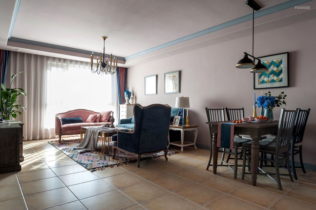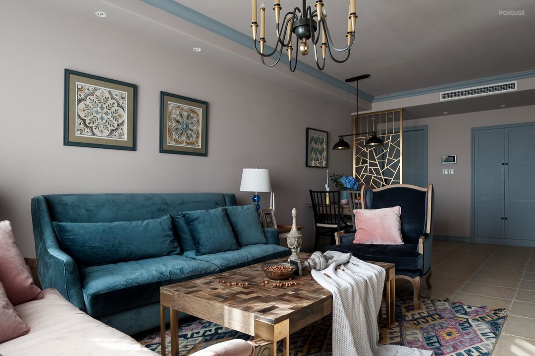客厅:由深蓝、灰粉、淡灰紫色构成的马卡龙色系客厅,展现色彩优雅的复古法式风情。布艺沙发,与木质茶几搭配,让空间倍感温暖。