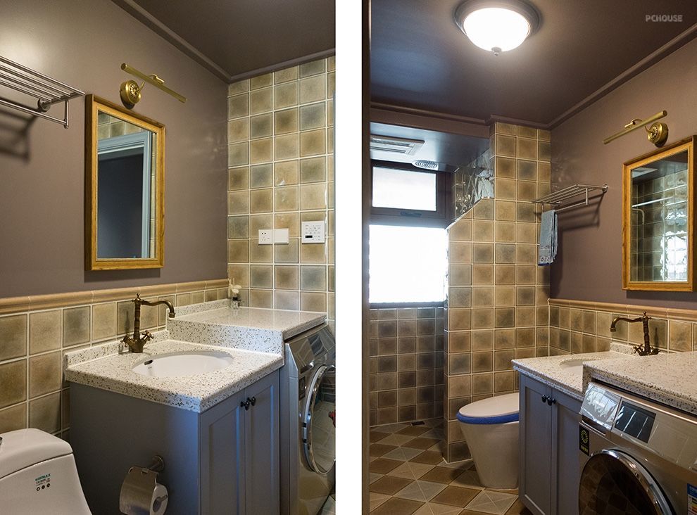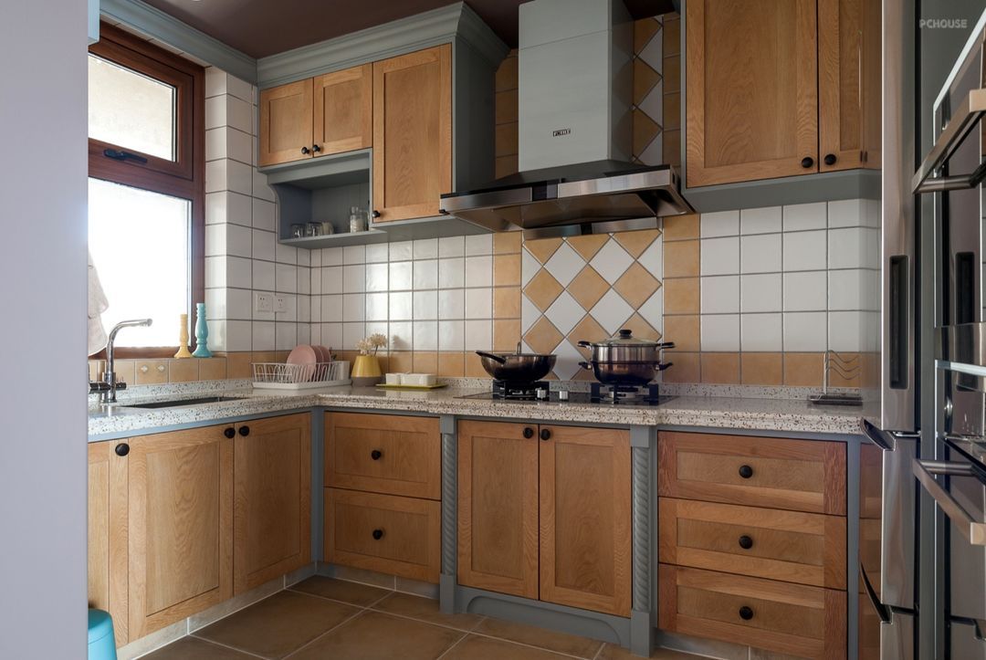 厨房:木质橱柜,搭配白色及原木色墙面砖,让厨房增添复古温馨的家居感受。周到体贴的空间规划,充分利用每一处可用的空间,橱柜上,大小、方向不一的多个抽屉,提供了更多储物空间。墙面的充分利用,也让大冰箱、烤箱、料理机等均有容身之处。