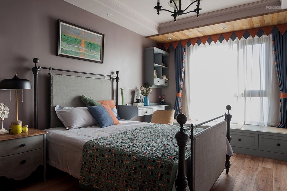 儿童房:儿童房增添橙色、绿等跳跃的色彩,使空间更具灵动气息。窗边窄窄的榻榻米设计,兼具了飘窗和储物的功能。