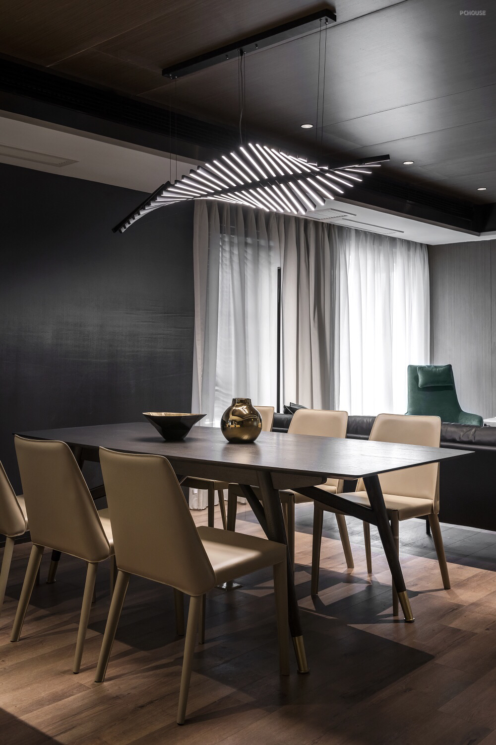 客厅利用深色系中的不同材质和颜色来进行空间的视觉分层,黑色的性感和质感是另类的表达,毕竟住的人也酷。