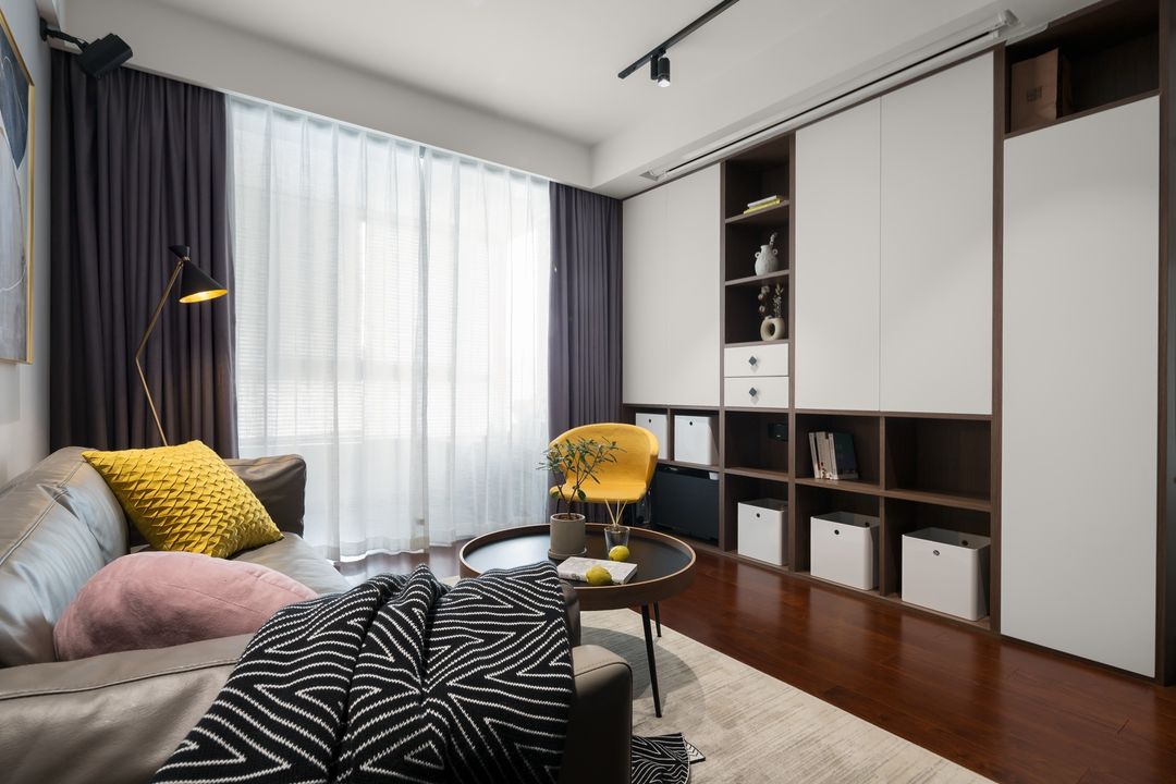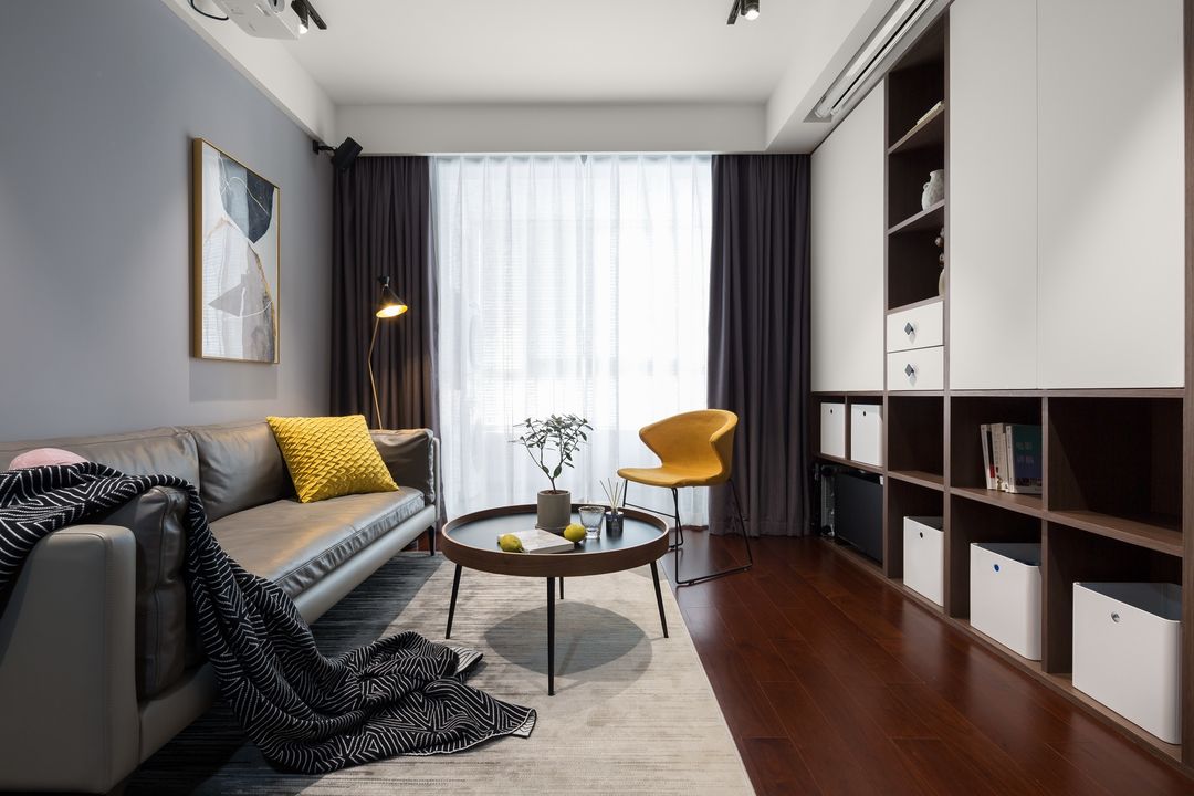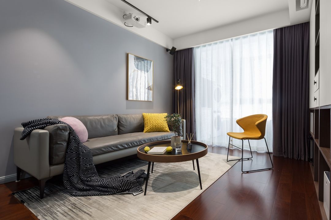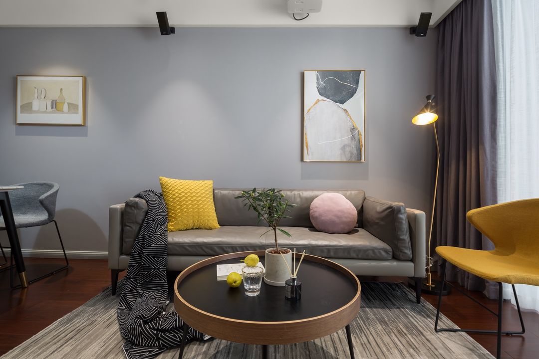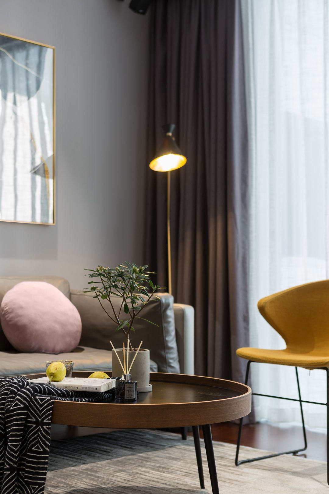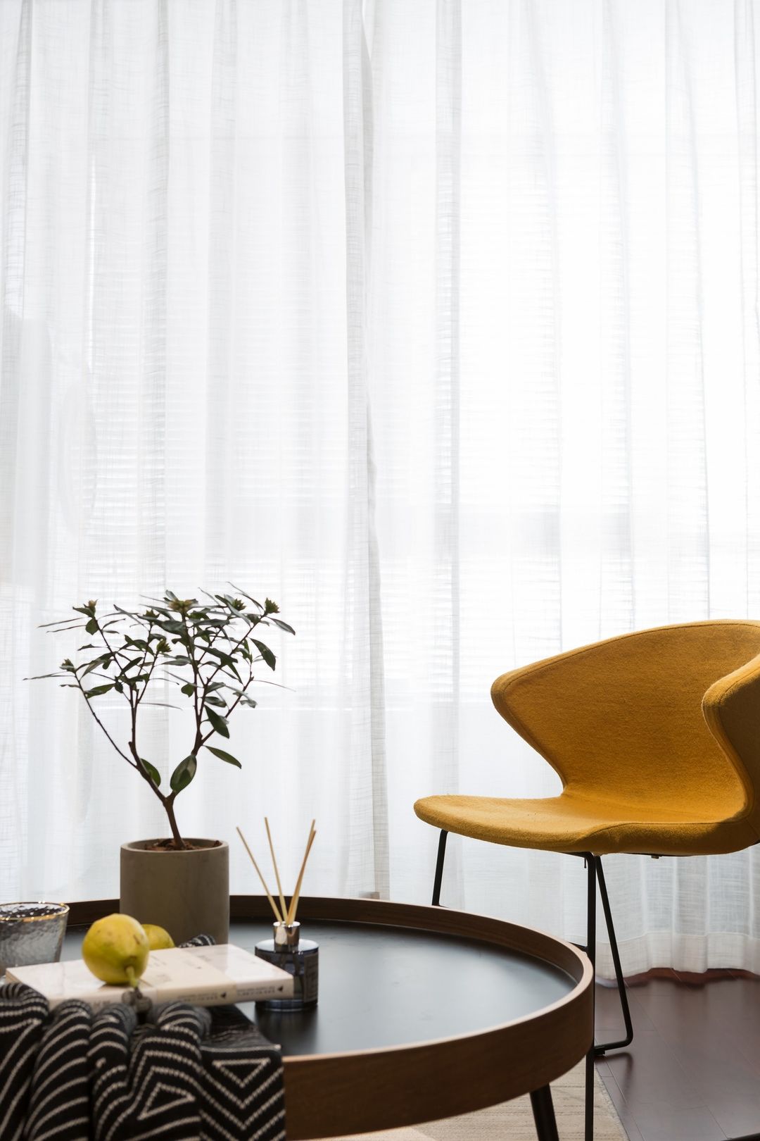 圆形茶几对于宝宝更友好安全,细腿家具可以让空间看起来更加宽敞,明黄色的单人椅点亮了整个空间。