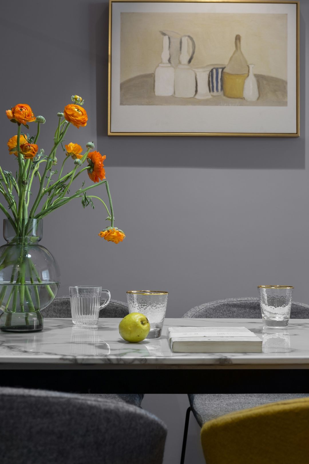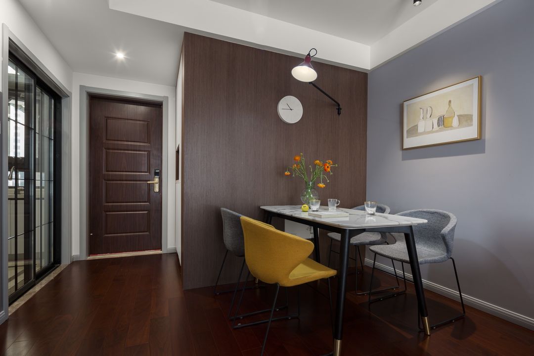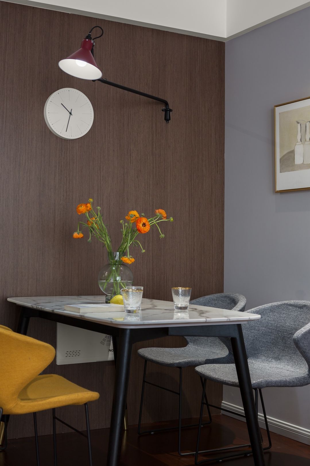 改造后门厅的鞋柜原来猪肝红的柜门换成了白色,进入门厅后首先就是餐厅,餐厅选用白色爵士白大理石桌面餐桌,墙面整体KD板整洁美观更好打理,厨房门口的一小块地方刷的半截磁性黑板漆,可以是孩子的早教板,也可以是家人的留言板。