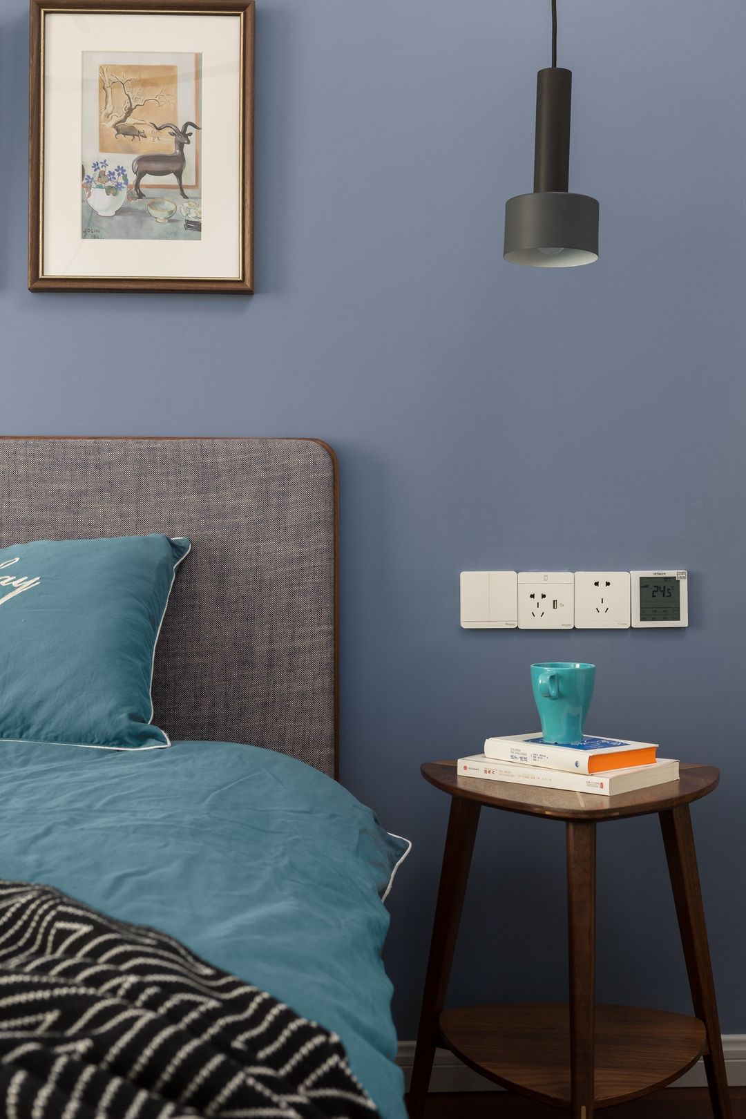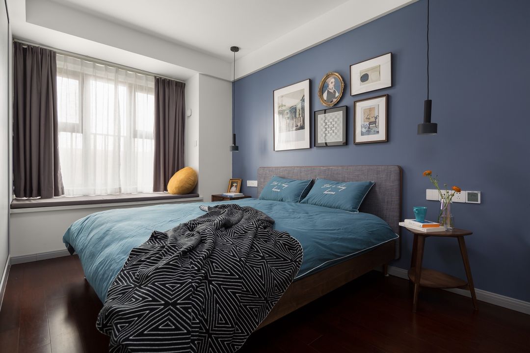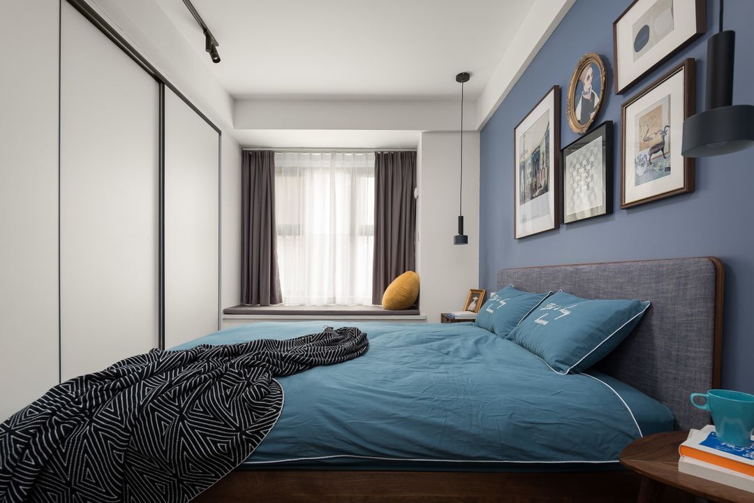 墙面颜色和同色系床品颜色搭配,携带宁静的蓝色和充满大自然气息的棕色……这些宁静色系可以营造出舒适宽广的空间感,给人柔美、高雅与平和的感觉,整体风格清淡雅致、宁静安稳。