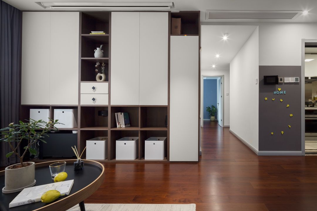 客厅舍弃了传统电视改成书柜加投影和环绕音响,针对不同使用需求。书柜下半部分做了开放式用来放置音响设备及孩子玩具收纳。