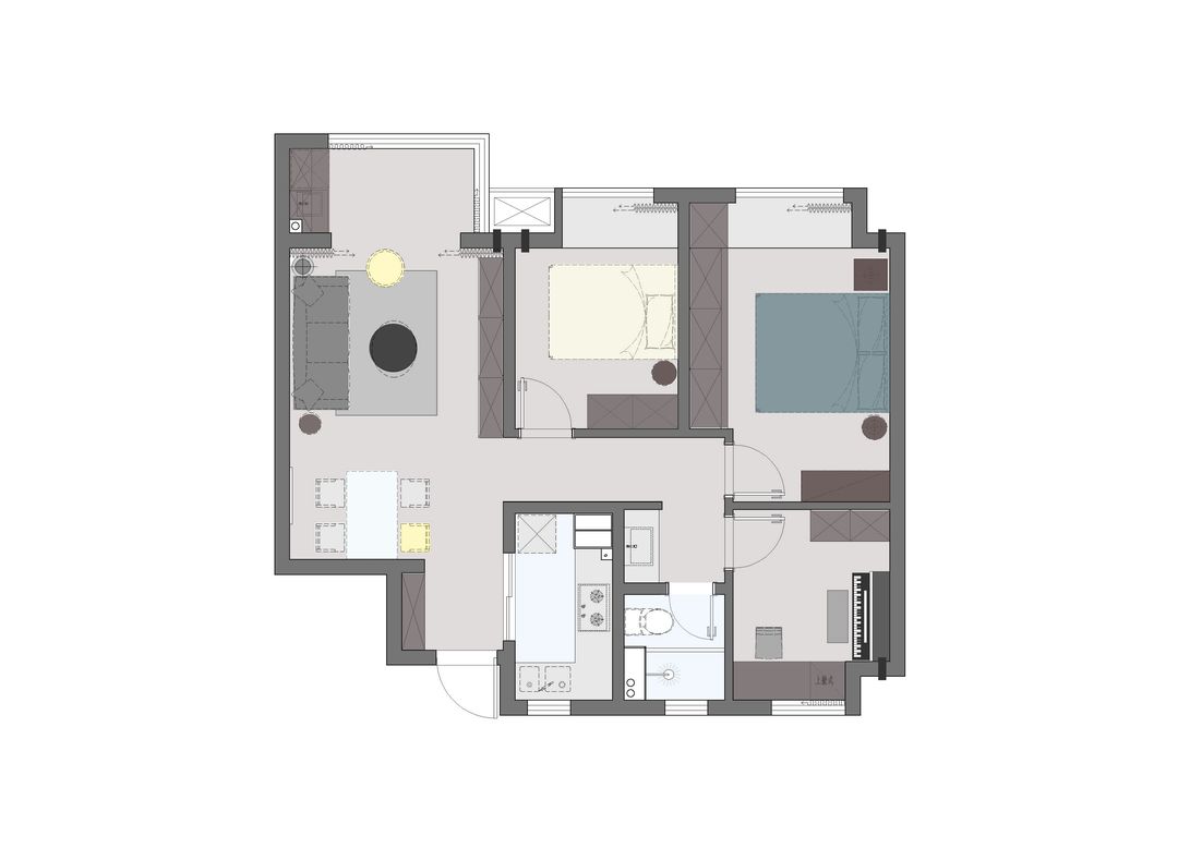 此户型很典型,属于紧凑型,但是每个空间都比较小,对于三口之家来说首要的需求就是如何更多的增加储物空间,但是又不会看起来很局促,设计师根据业主的实际需求和现场情况,一方面从色彩上做了改变,一方面尽可能的增加储物空间。
