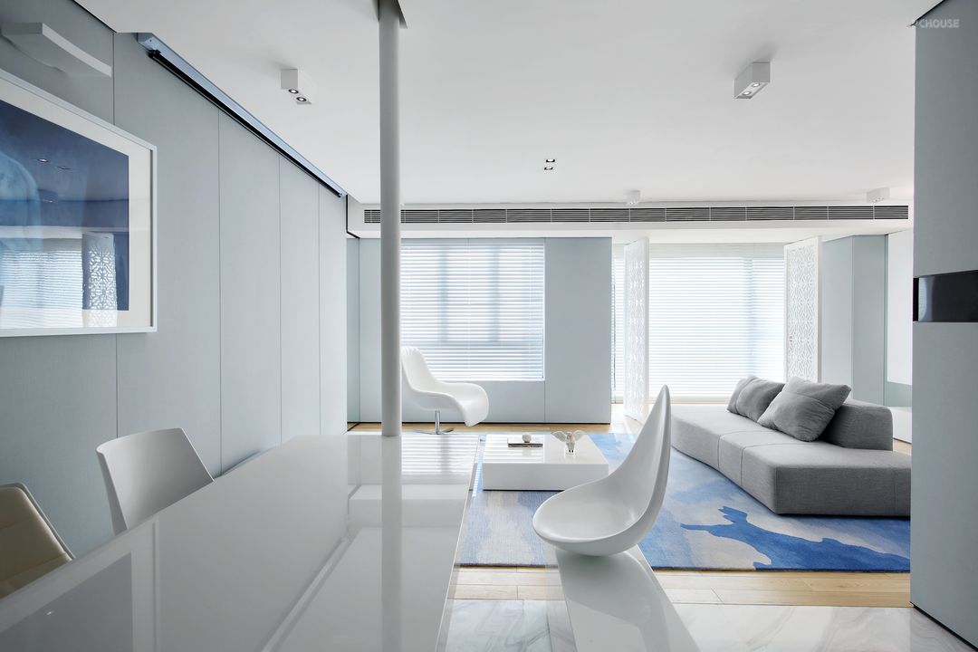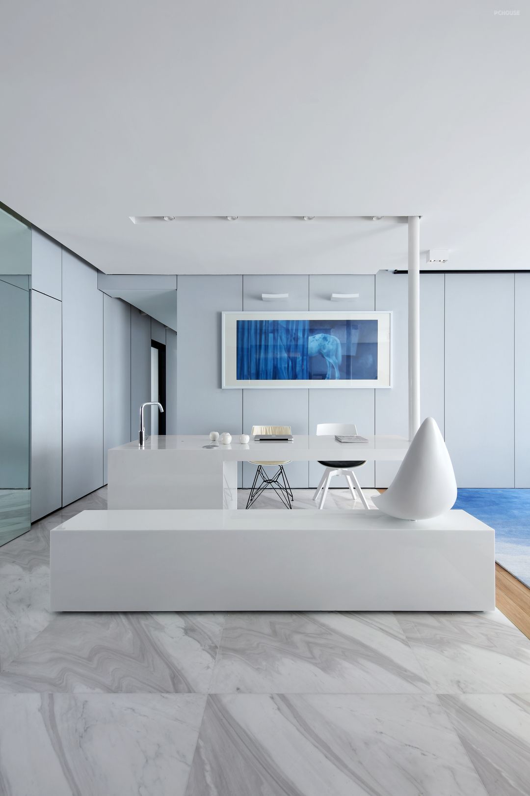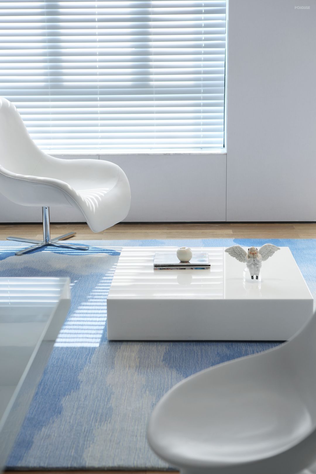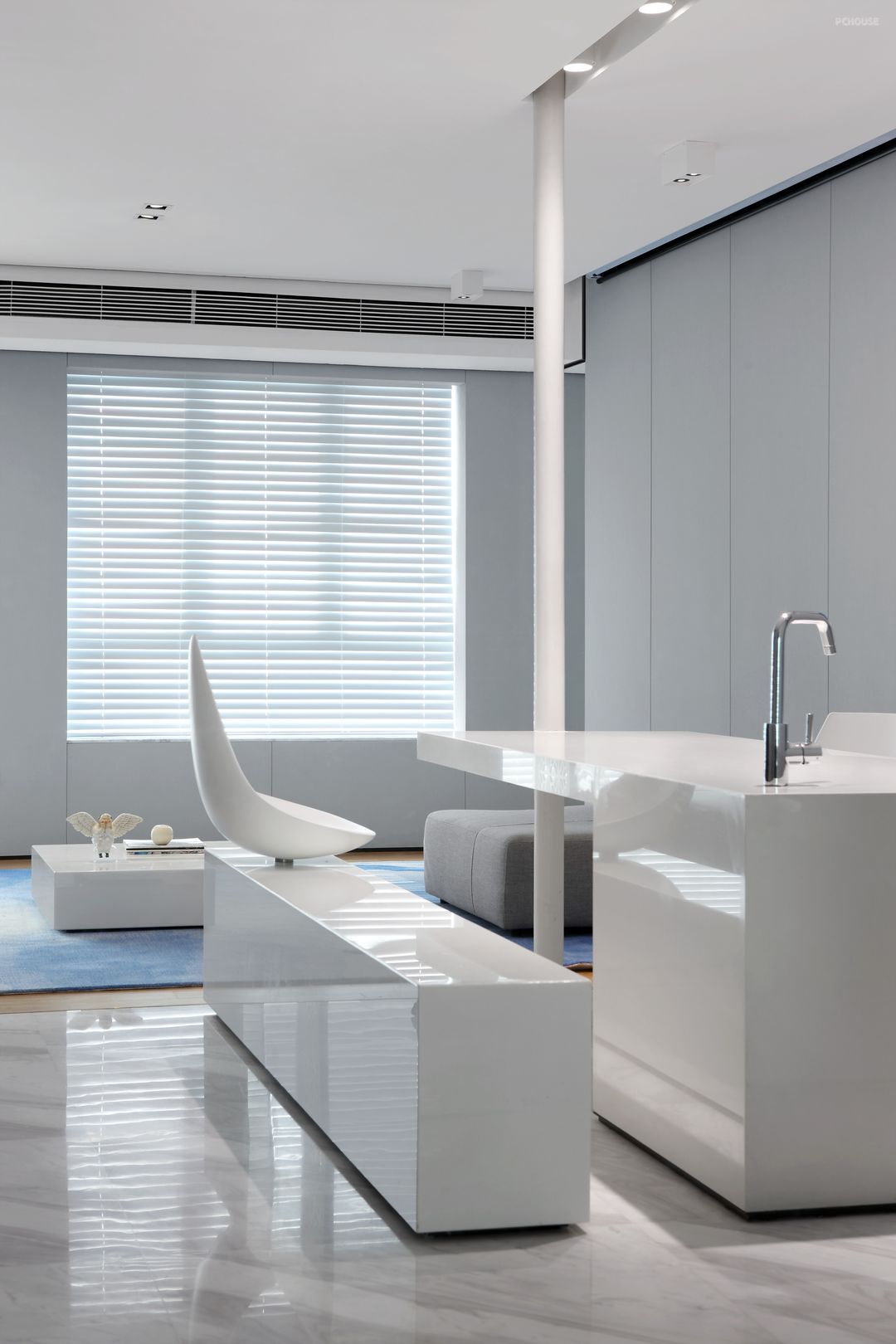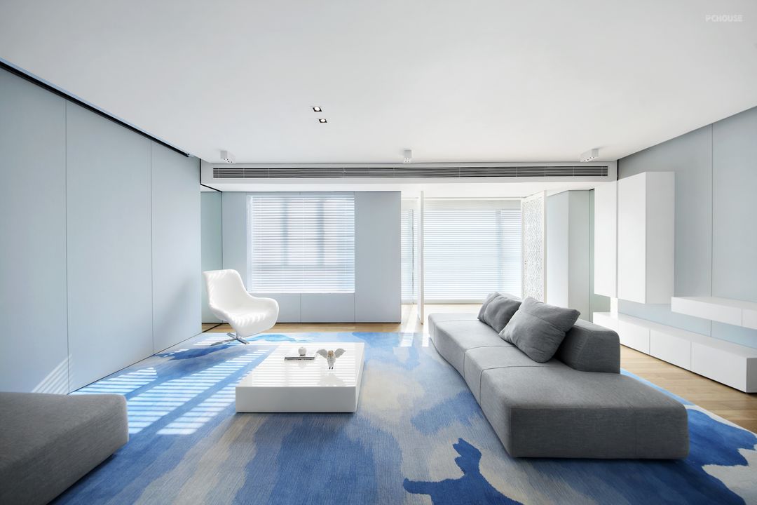 客厅的大幅挂画是主要的装饰物,起到提升客厅艺术氛围的作用,挂画方位面向阳台外蔚蓝的海平面,纯粹的蓝色在自然光底下显得更有质感和层次。除此之外,客厅地毯也是特别订造,务求贯彻极具比例元素的设计,地毯为不同程度的蓝色,极具质感,同时也是空间的分界标志,地毯中央是方形、白色光亮的可丽耐叉戟,摆放着雕塑艺术家瞿广慈的天使作品,一边搭配灰色的意大利B&B布艺沙发,另一边是B&B的纯白色皮质单椅,线条流畅。