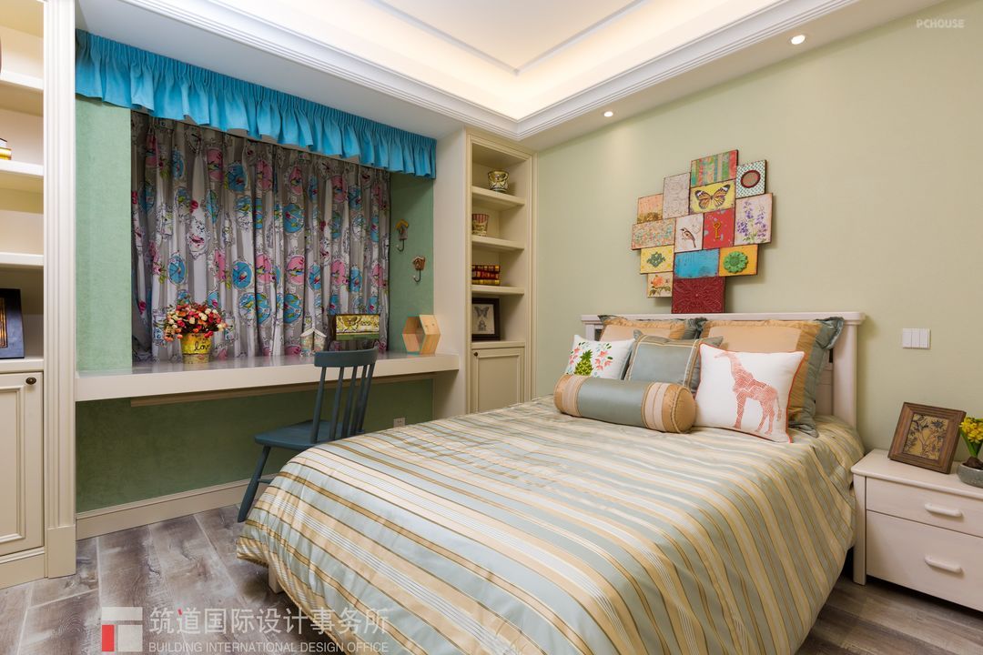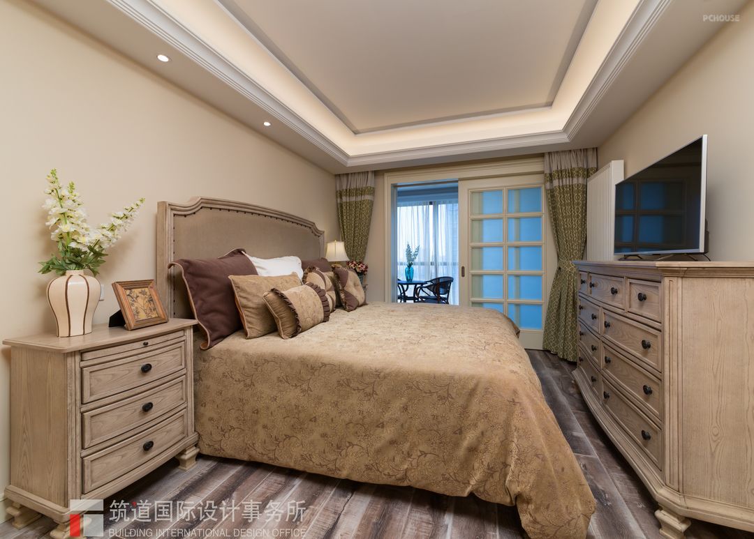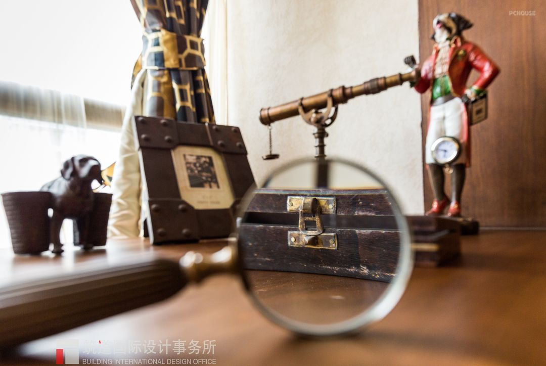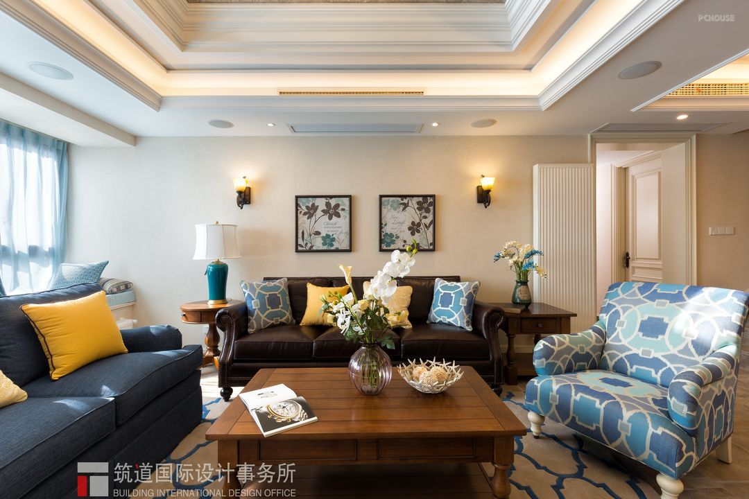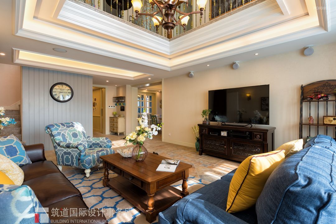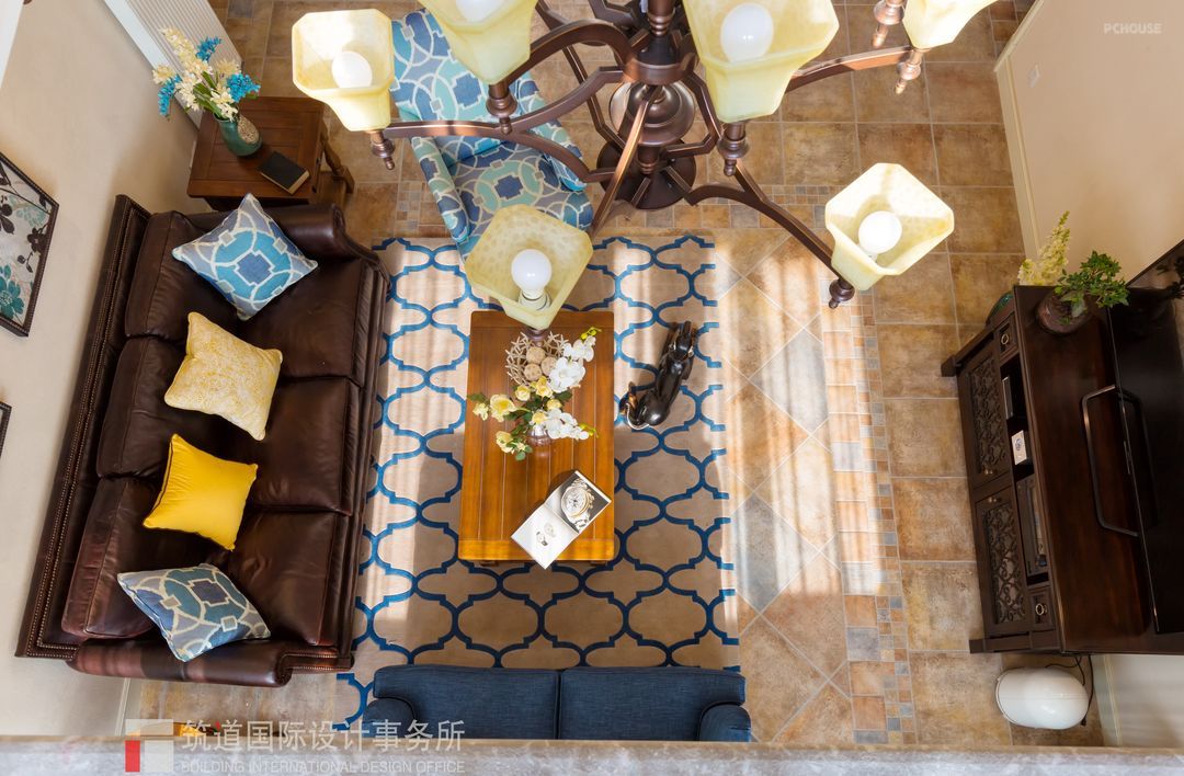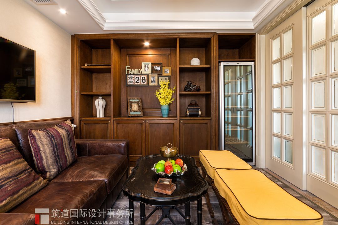 再以经典美式风格的咖色真皮沙发及做旧实木家具,颜色对比明亮活跃,让整体空间充满美式风格又不失活力。