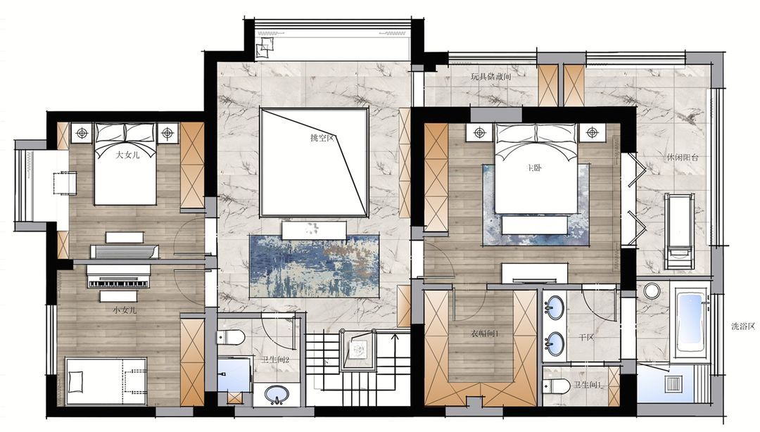 空间色调以大地色为基础,营造了家庭温馨的基调。