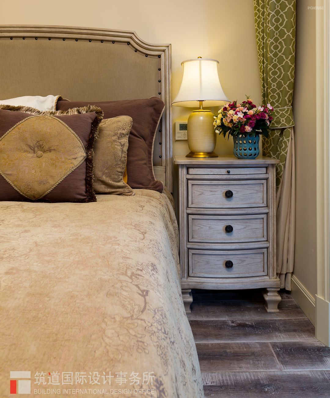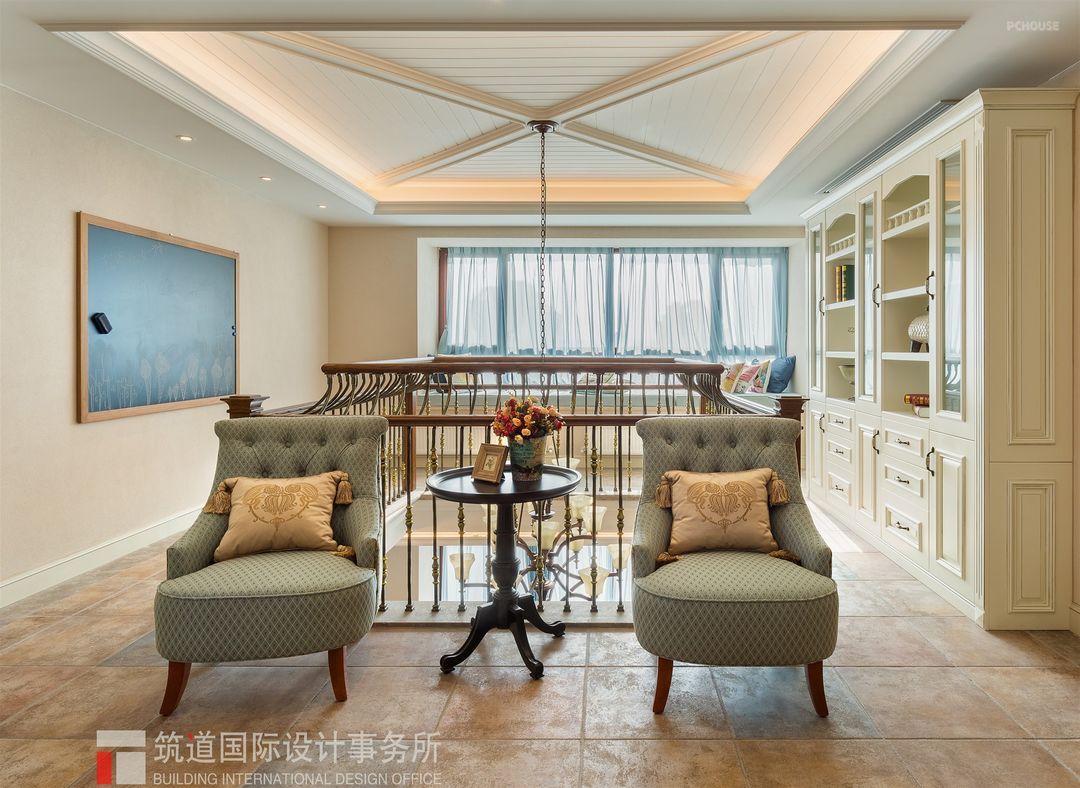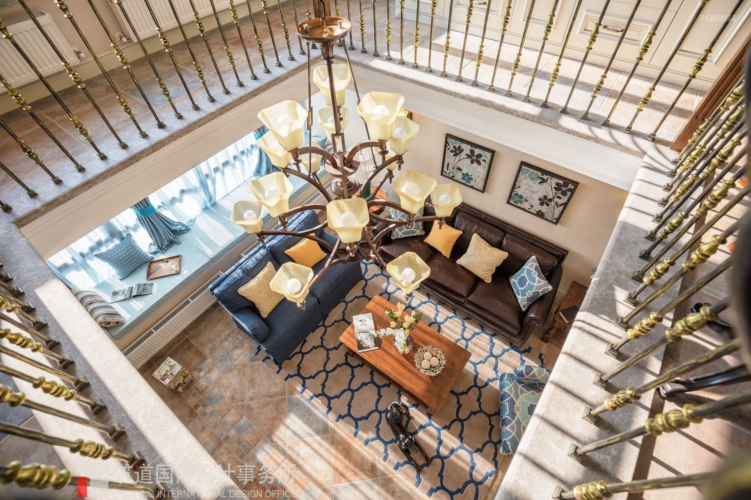 二楼顶面垂下的颇具美式风格的吊灯将二楼和一楼串联在了一起,增加了空间的连续性及整体性。