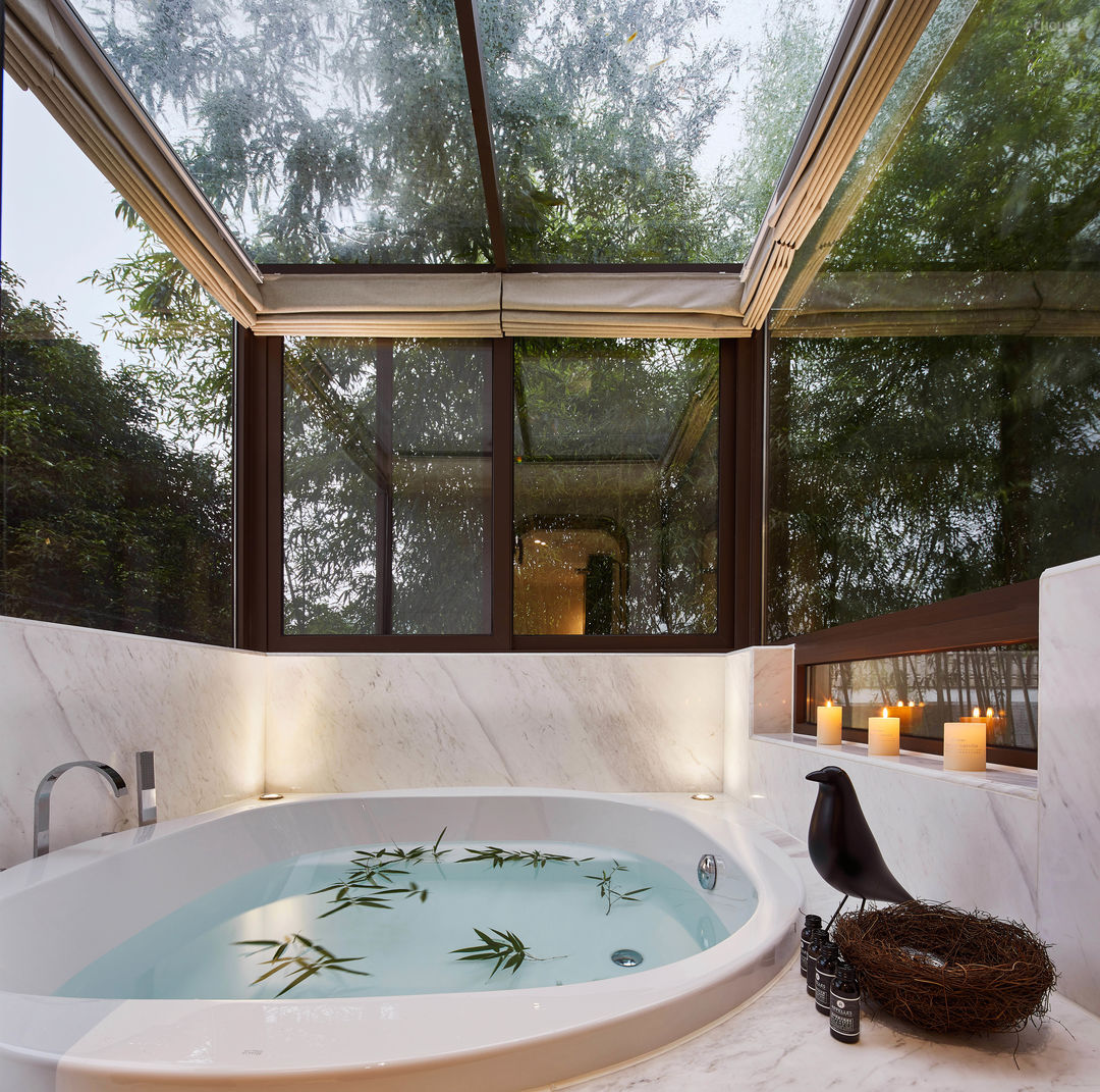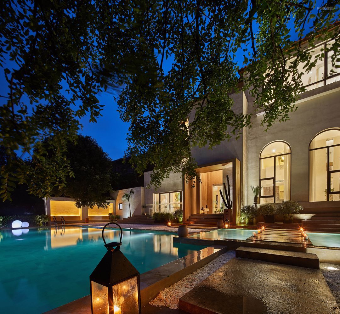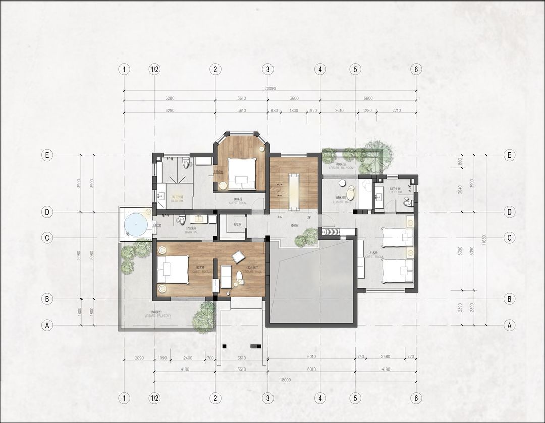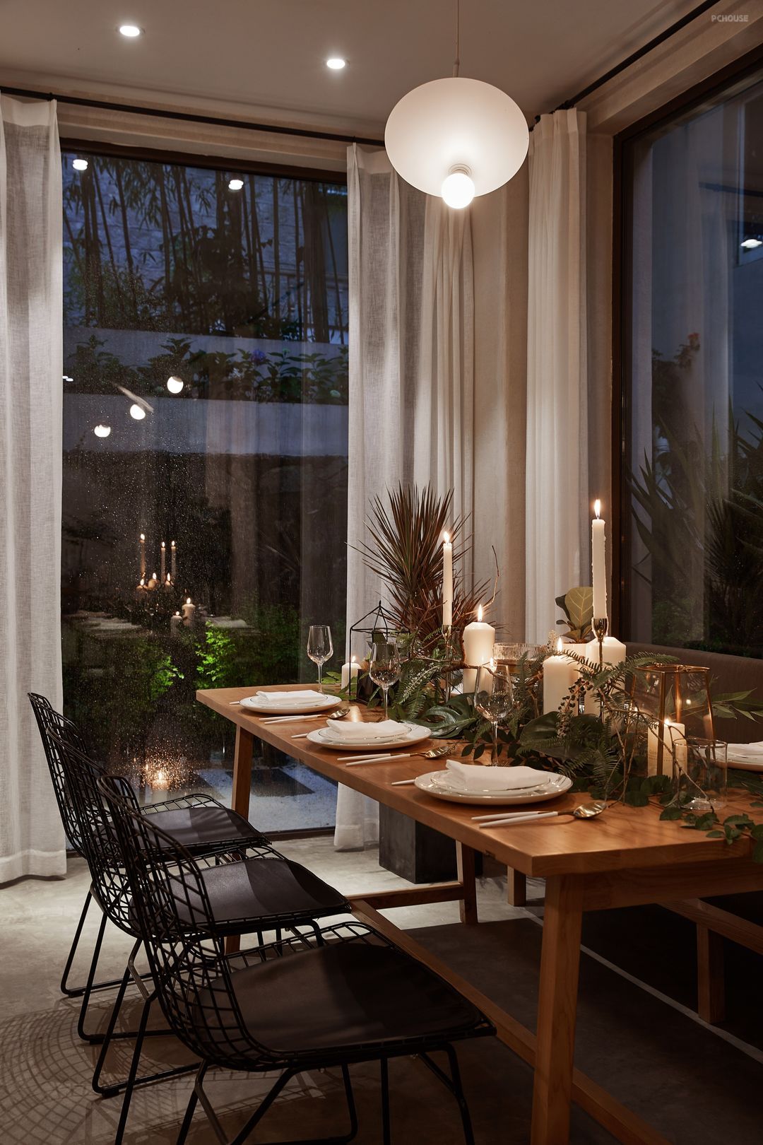 汀步式走道设计。在庭院间有一片景观水池和一片泳池,在穿插的水池间横置一个步道,设计师意在放缓行人的脚步,伴随着涓涓的水流声,感受最纯粹的自然风情。