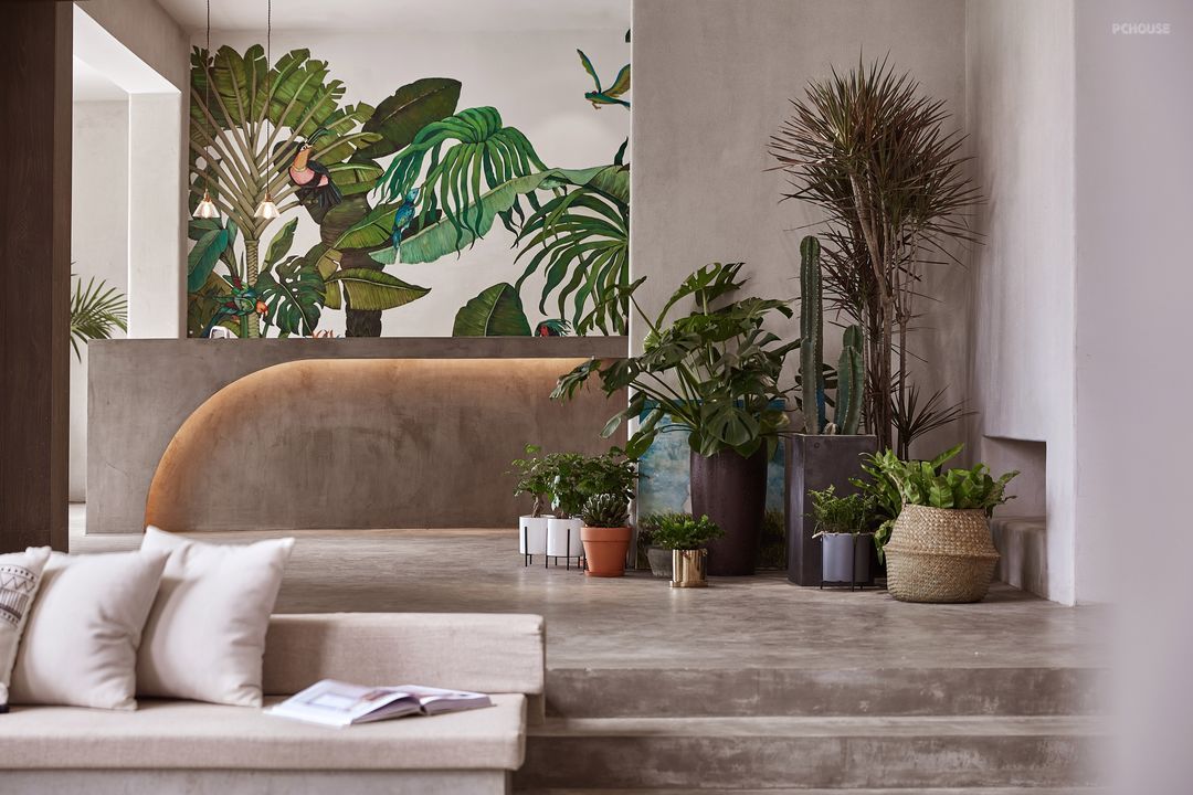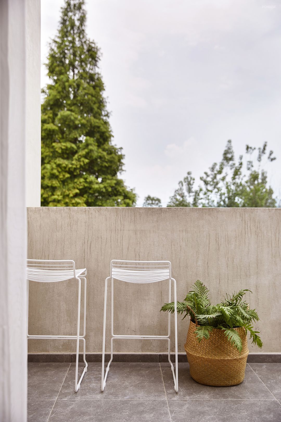 可以看到另一边放置着木桌与坐垫,周围植物环绕,仿佛置身于大森林中,没有过多的装饰,希望室内是安静简单的,更多地是享受户外的自然,营造塔莎奶奶式的被植物围绕的自在空间。