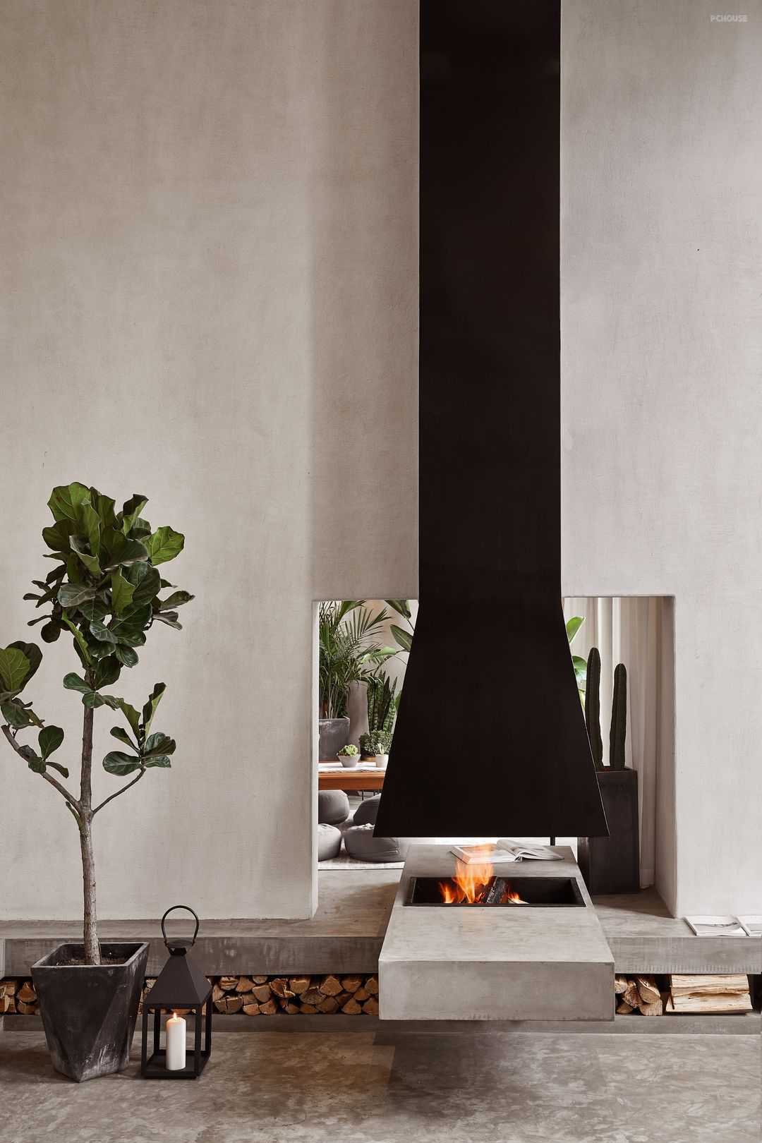 步入室内,将空间做了动静分区,一层原本的房间打通,变成了全开放共享的空间。并且做了下沉式设计,将空间聚焦于此,冬天可以感受火炉带来的温暖,透过拱形的大玻璃眺望远方极致的风景,享受慵懒自在的时光。墙体与火炉的穿插式设计,提升空间趣味性。