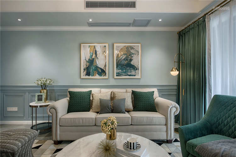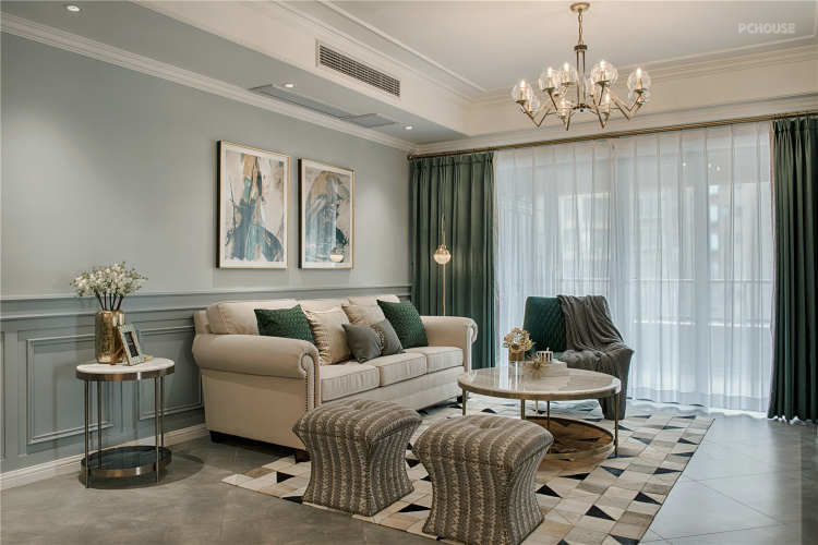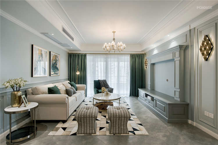客厅以灰色系为基调搭配暖色灯光为辅助摈弃了美式的繁重感对局部做了减法使整个空间显得更加简洁干练