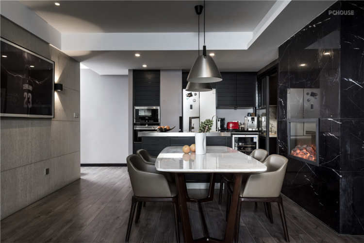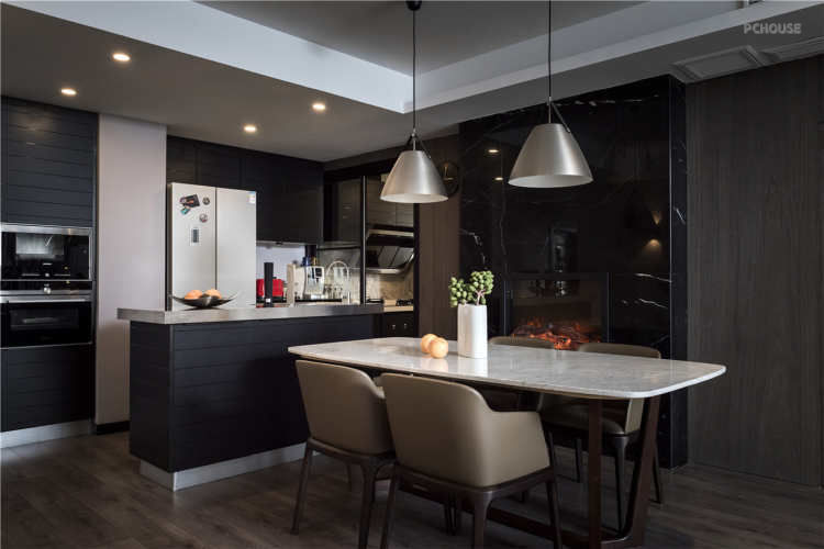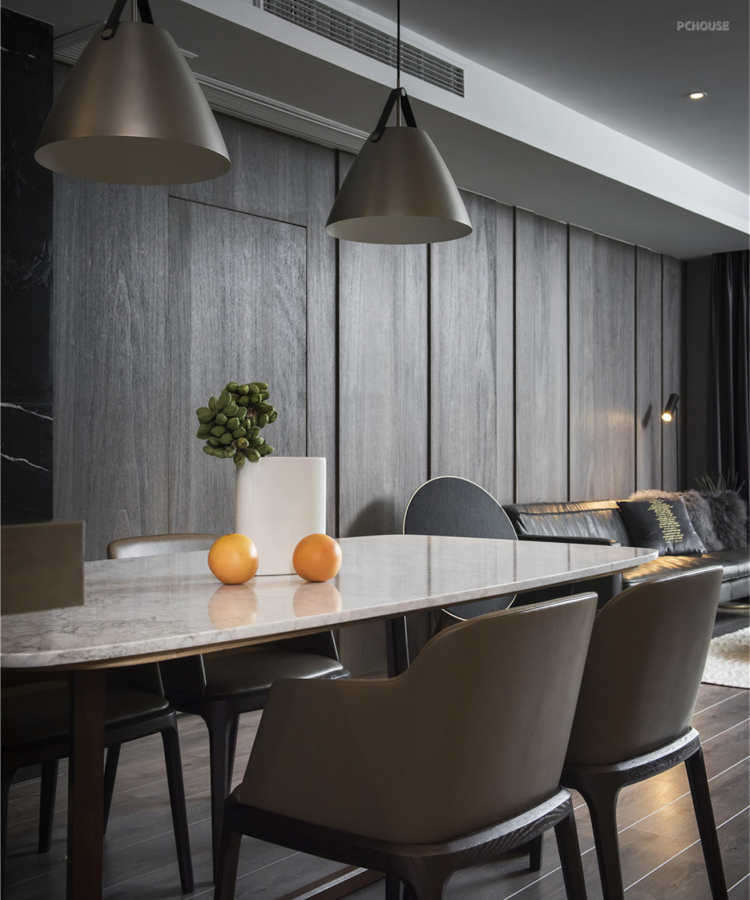 餐厅与客厅相邻,也是一样的深色系风格。一个厚实的大理石台面、实木腿的餐桌,还有四张深棕色的餐椅,尽显格调。
