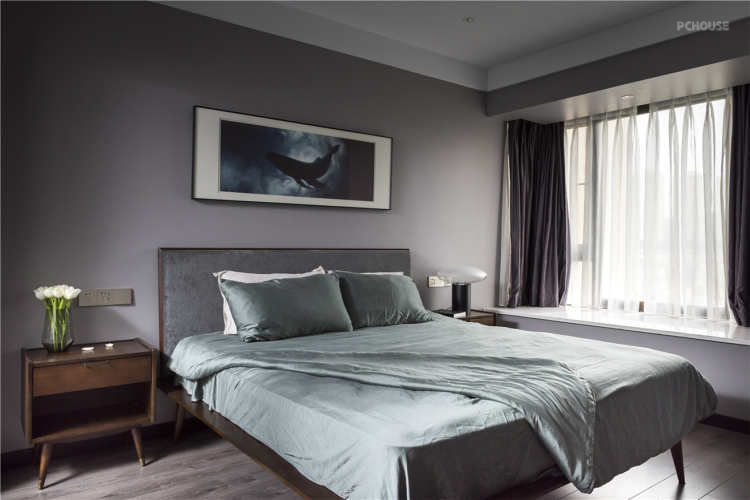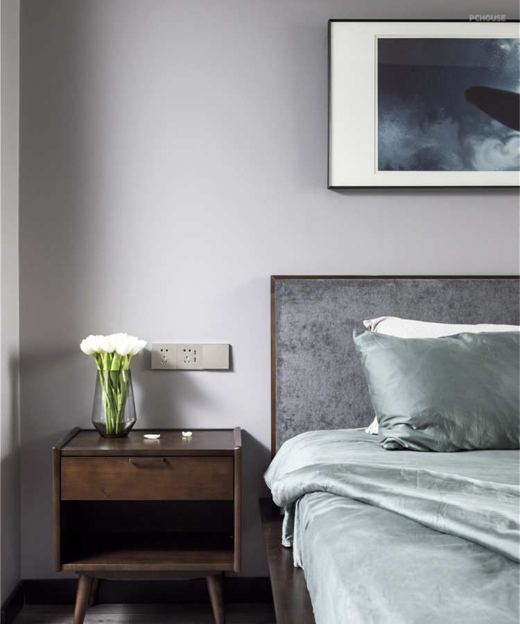 床头柜上的小摆件与花卉,为这个简洁的卧室增添了几分艺术感。