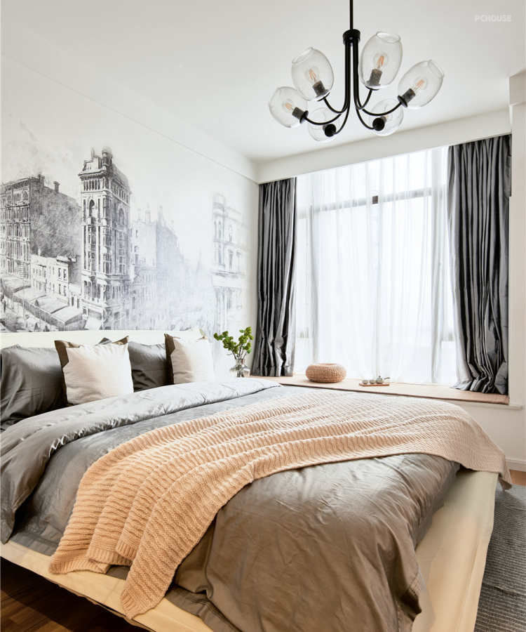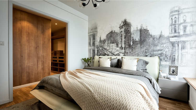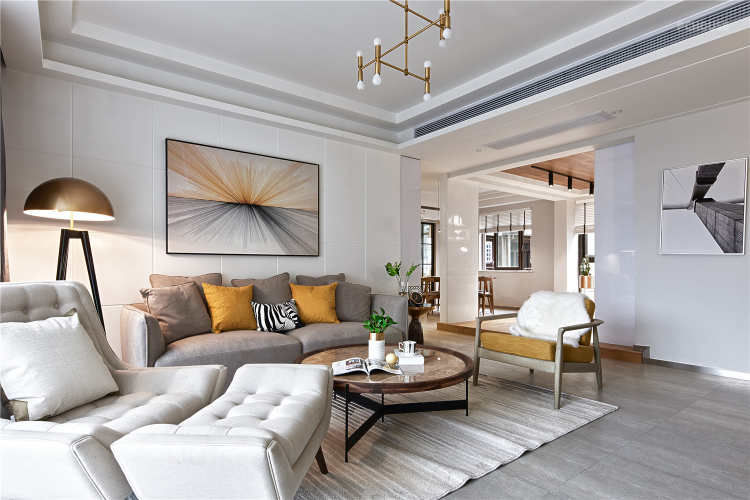 未加过多修饰的白墙,从视觉上延伸空间,增强通透性。挂画和抱枕的金色元素打破黑白灰的简洁,冷感中添暖意。